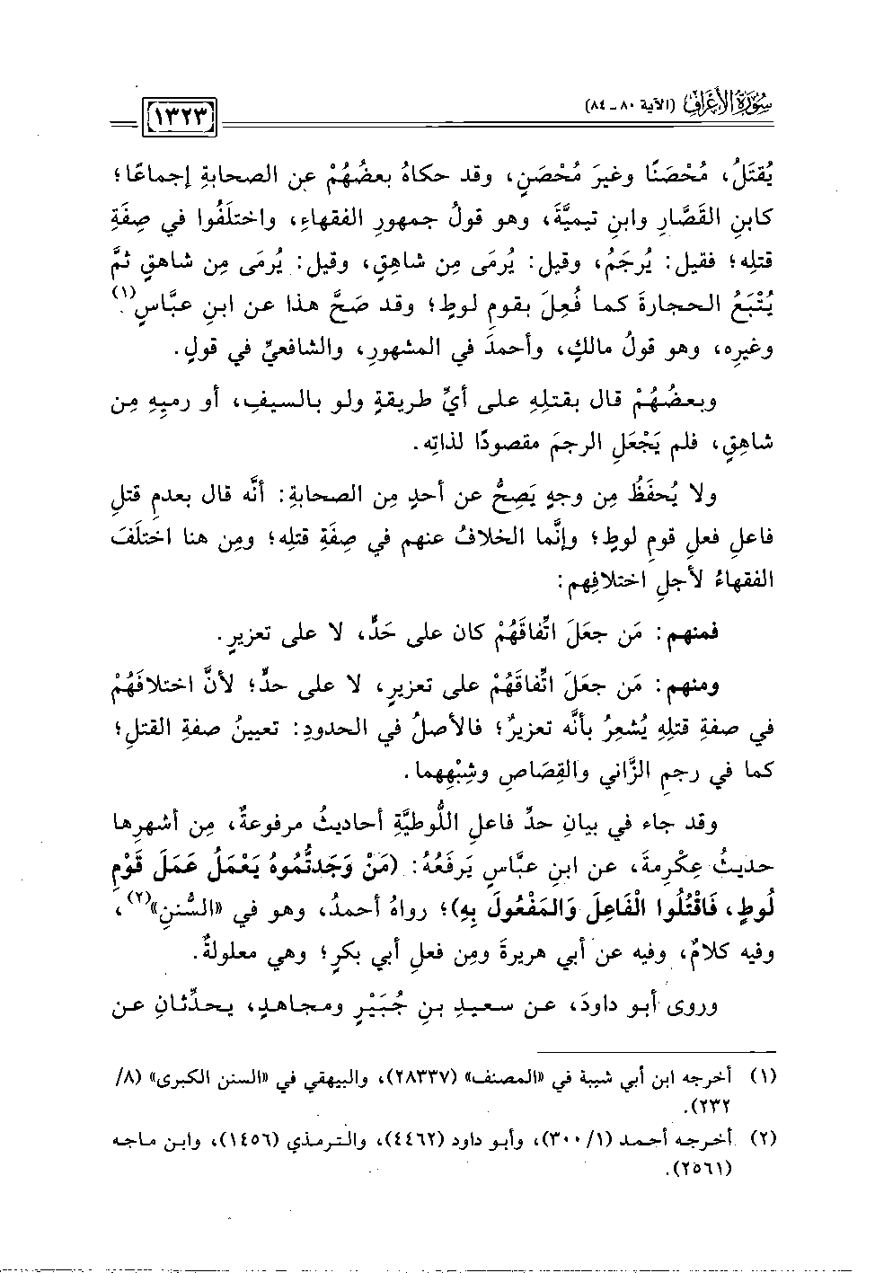 وقد جاء في بيانِ حدِّ فاعلِ اللُّوطيَّةِ أحاديثُ مرفوعةٌ، مِن أشهرِها حديثُ عِكرِمةَ، عن ابنِ عباسٍ يَرفَعُهُ: (مَنْ وَجَدتُّمُوهُ يَعْمَلُ عَمَلَ قَوْمِ لُوطٍ، فَاقتُلُوا الفَاعِلَ وَالمَفعُولَ بِهِ)؛ رواةُ أحمدُ، وهو في "السُّننِ" (٢)، وفيه كلامٌ، وفيه عن أبي هريرةَ ومِن فعلِ أبي بكرٍ؛ وهي معلولةٌ.