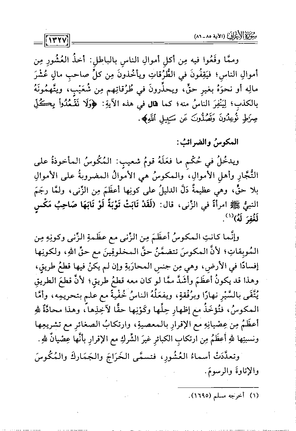 ويدخُلُ في حُكمِ ما فعَلَهُ قومُ شعيبٍ: المُكُوسُ المأخوذةُ على التُّجَّارِ وأهلِ الأموال، والمكوسُ هي الأموالُ المضروبةُ على الأموالِ بلا حقّ، وهي عظيمةٌ دَلَّ الدليلُ على كونِها أعظَمَ مِن الزِّنى، ولمَّا رجَمَ النبيُّ - صلى الله عليه وسلم - امرأةً في الزِّنى، قال: "لَقَدْ تَابَتْ تَوْبَةً لَوْ تَابَهَا صَاحِبُ مَكسٍ لَغُفِرَ لَهُ" (١).