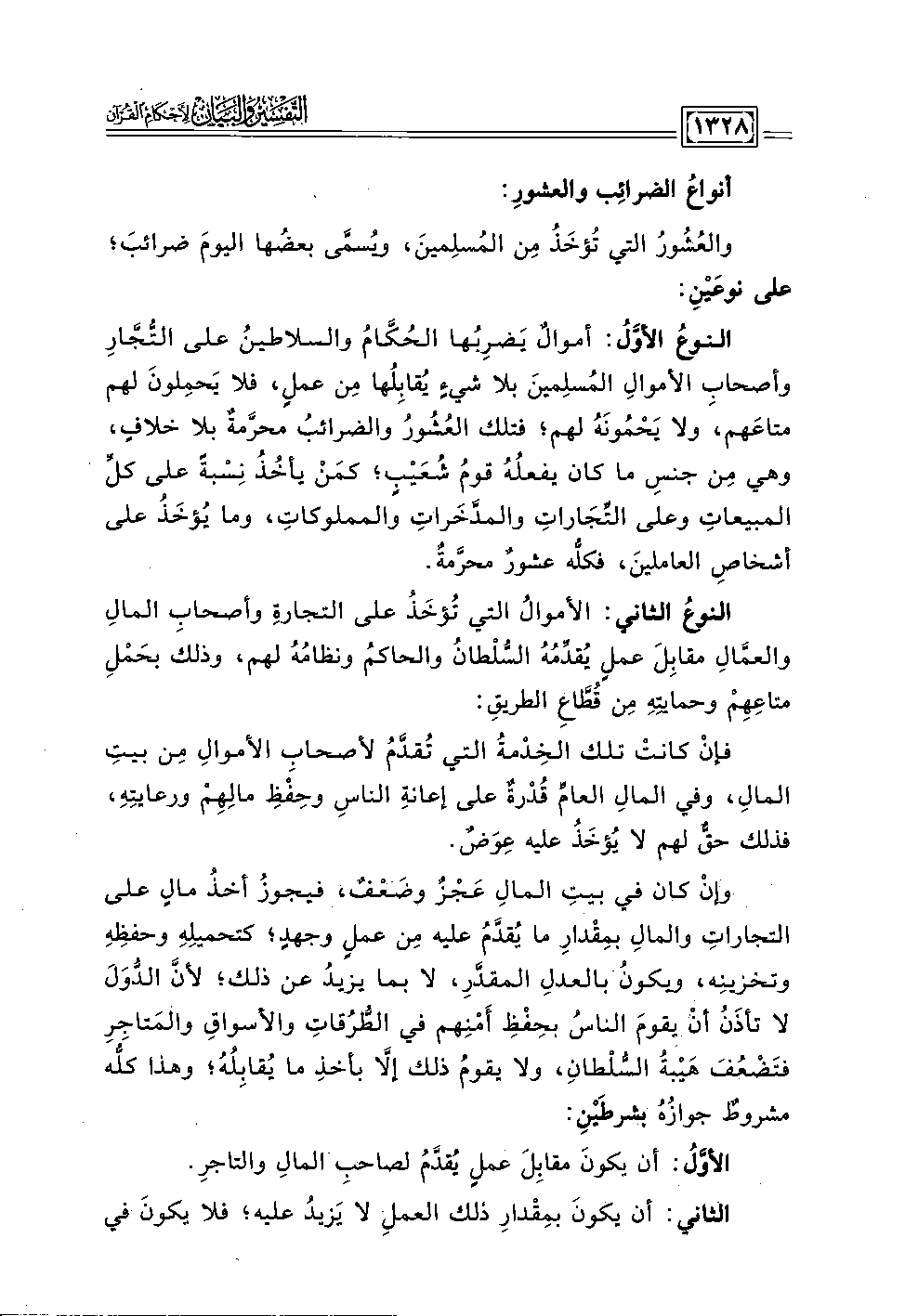 النوعُ الأوَّلُ: أموالٌ يَضرِبُها الحُكَّامُ والسلاطينُ على التُّجَّارِ وأصحابِ الأموالِ المُسلِمينَ بلا شيءٍ يُقابِلُها مِن عملٍ، فلا يَحمِلونَ لهم متاعَهم، ولا يَحْمُونَهُ لهم؛ فتلك العُشُورُ والضرائبُ محرَّمةٌ بلا خلافٍ، وهي مِن جنس ما كان يفعلُهُ قومُ شُعيْبٍ؛ كمَنْ يأخُذُ نِسْبةً على كلِّ المبيعاتِ وعلى التِّجَاراتِ والمدَّخَراتِ والمملوكات، وما يُؤخَذُ على أشخاصِ العاملينَ، فكلُّه عشورٌ محرَّمةٌ.