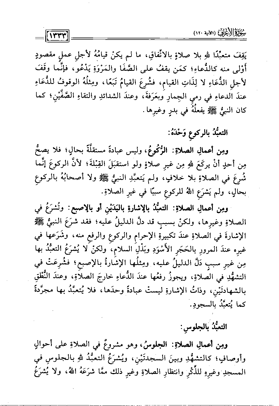 ومِن أعمالِ الصلاةِ: التعبُّدُ بالإشارةِ باليَدَيْنِ أو بالإصبع: وتُشرَعُ في الصلاةِ وغيرِها، ولكن بسببٍ قد دلَّ الدلِيلُ عليه؛ فقد شرَعَ النبيُّ - صلى الله عليه وسلم - الإشارةَ في الصلاةِ عندَ تكبيرةِ الإحرامِ والركوعِ والرفعِ مه، وشَرَعها في غيرِه عندَ المرورِ بالحَجَرِ الأَسْوَدِ وبَذْلِ السلام، ولكنْ لا يُشرَعُ التعبُّدُ بها مِن غيرِ سببٍ دَلَّ الدليلُ عليه، ومِثلُها الأشَارةُ بالإصبعِ؛ فشُرِعَت في التشهُّدِ في الصلاة، ويجورُ رفعُها عندَ الدُّعاءِ خارجَ الصلاة، وعندَ النُّطْقِ بالشهادتَين، وذاتُ الإشارةِ ليست عبادةً وحدَها، فلا يُتعبَّدُ بها مجرَّدةً كما يُتعبَّدُ بالسجودِ.