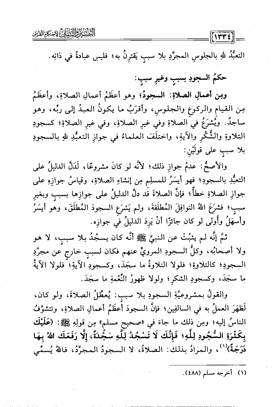 والقولُ بمشروعيَّةِ السجودِ بلا سببٍ: يُعطِّلُ الصلاةَ، ولو كان، لَظهَرَ العمل به في السالفِين؛ فإنَّ السجودَ أَعظَمُ أعمالِ الصلاة، وتتشوَّفُ الناسُ إليه؛ ومِن ذلك ما جاءَ في "صحيحِ مسلمٍ" مِن قولِهِ - صلى الله عليه وسلم -: (عَلَيْكَ بِكَثْرَةِ السُّجُودِ لِلَّهِ؛ فَإِنَّكَ لَا تَسْجُدُ لِلَّهِ سَجْدَةً، إلَّا رَفَعَكَ اللهُ بِهَا دَرَجَةً) (١)، والمرادُ بذلك: الصلاةُ، لا السجودُ المجرَّدُ، فاللهُ يُسمِّي