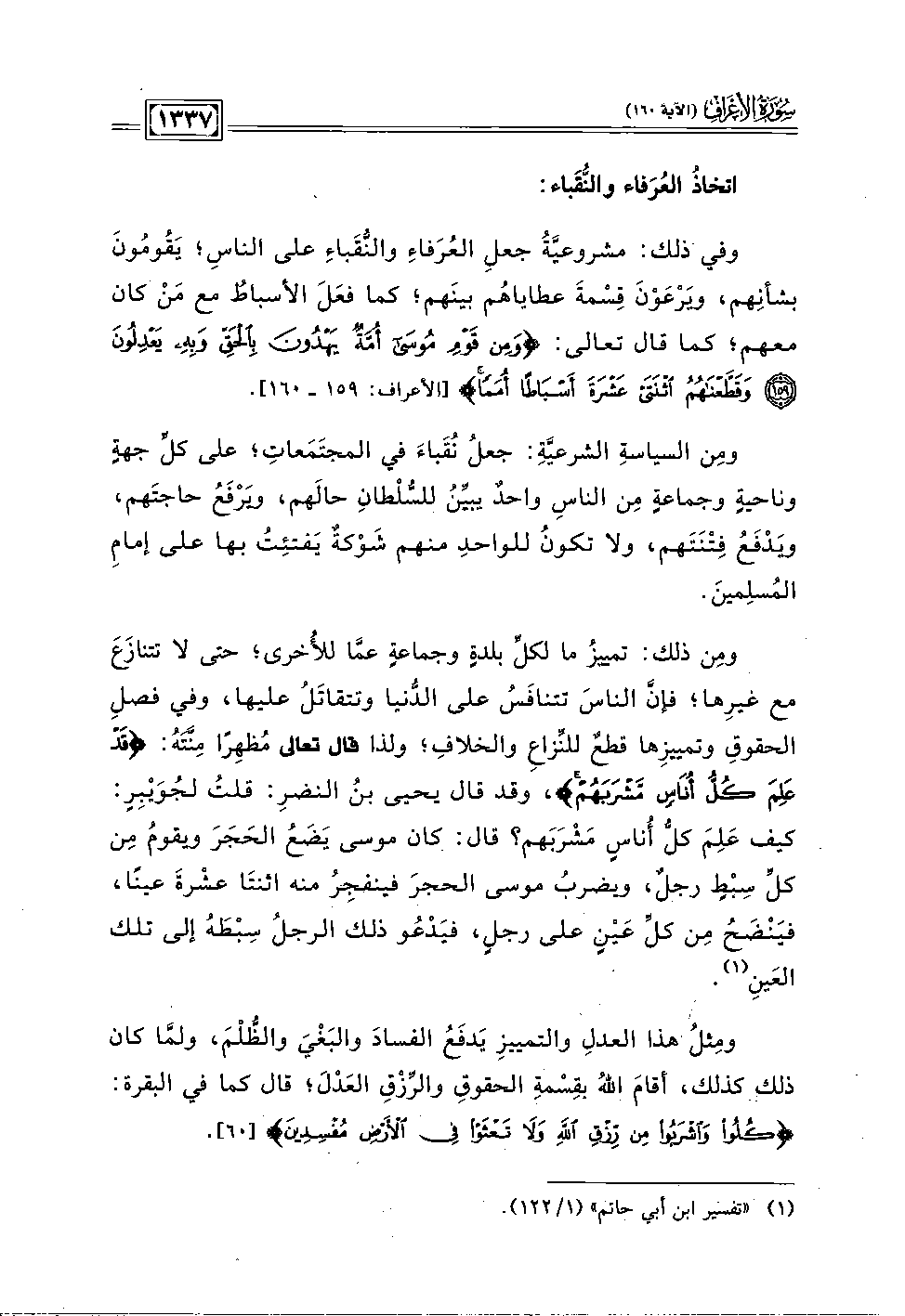 ومِن ذلك: تمييزُ ما لكلِّ بلدةٍ وجماعةٍ عمَّا للأُخرى، حتى لا تتنازَعَ مع غيرِها؛ فإنَّ الناسَ تتنافَس على الدُّنيا وتتقاتَلُ عليها، وفي فصلِ الحقوقِ وتمييزِها قطعٌ للنِّزاعِ والخلافِ؛ ولذا قال تعالى مُظهِرًا منَّتَهُ: {قَدْ عَلِمَ كُلُّ أُنَاسٍ مَشْرَبَهُمْ}، وقد قال يحيى بن النضرِ: قلتُ لجُوَيْبِرٍ: كيف عَلِمَ كل أناسٍ مَشْرَبَهم؟ قال: كان موسى يَضَعُ الحَجَرَ ويقومُ مِن كلِّ سِبْطٍ رجلٌ، ويضربُ موسى الحجرَ فينفجِرُ منه اثنتَا عشْرةَ عينًا، فينْضَحُ مِن كلِّ عَيْنٍ على رَجلٍ، فيَدْعُو ذلك الرجلُ سِبْطَهُ إلى تلك العَينِ (١).
