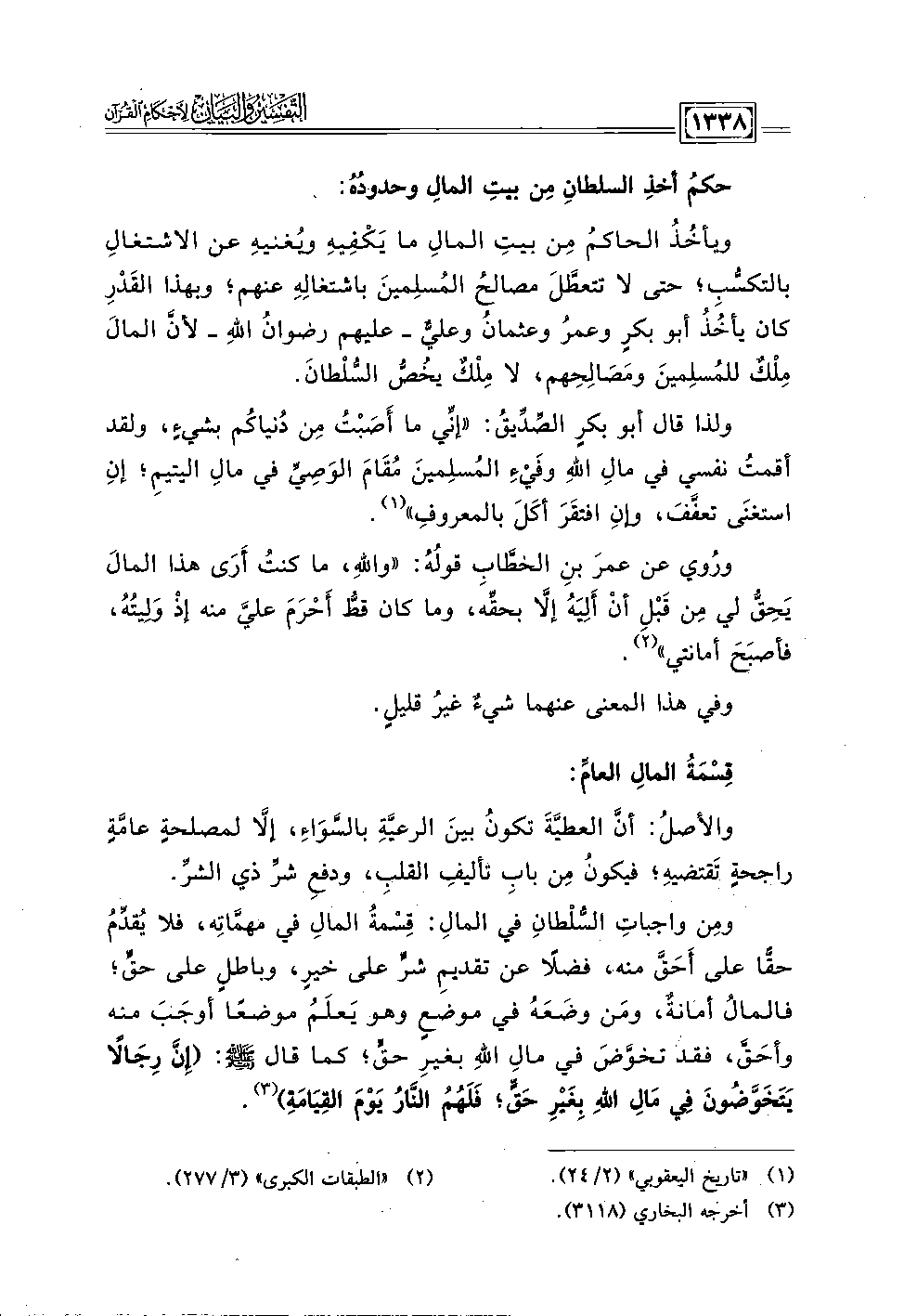 ويأخُذُ الحاكمُ مِن بيتِ المالِ ما يَكفِيهِ ويُغنيهِ عن الاشتغالِ بالتكسُّبِ؛ حتى لا تتعطَّلَ مصالحُ المُسلِمينَ باشتغالِهِ عنهم؛ وبهذا القَدْرِ كان يأخُذُ أبو بكرٍ وعمرُ وعثمانُ وعليٌّ -عليهم رضوانُ اللهِ- لأنَّ المالَ مِلْكٌ للمُسلِمينَ ومصَالِحِهم، لا مِلْكٌ يخُصُّ السُّلْطانَ.