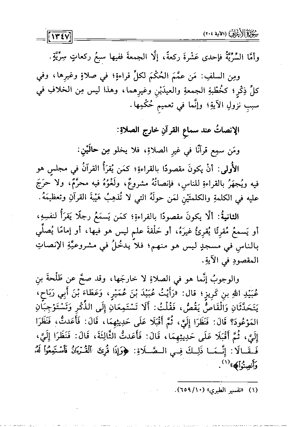 والوجوبُ إنما هو في الصلاةِ لا خارجَها، وقد صحَّ عن طَلْحةَ بنِ عُبَيدِ الله بنِ كَرِيزٍ؛ قال: "رَأَيْتُ عُبَيْدَ بْنَ عُمَيْرٍ، وَعَطَاءَ بْنَ أبِي رَبَاح، يَتَحَدّثَانِ وَالقَاصُّ يَقُصُّ، فَقُلْتُ: أَلَا تسْتَمِعَانِ إِلَى الذِّكرِ وَتَسْتوْجبَانِ المَوْعُودَ؟ قَالَ: فَنَظَرَا إِلَيَّ، ثُمَّ أقْبَلَا عَلَى حَدِيثهِمَا، قَالَ: فَأَعَدتُّ، فَنَظَرَا إِلَيَّ، ثُمَّ أقبَلَا عَلَى حَدِيثهِمَا، قَالَ: فَأَعَدتُّ الثَّالِثَّةَ، قَالَ: فَنَظَرَا إِلَيَّ، فَقَالَا: إِنَّمَا ذَلِكَ فِي الصَّلَاةِ: {وَإِذَا قُرِئَ الْقُرْآنُ فَاسْتَمِعُوا لَهُ وَأَنْصِتُوا} (١).