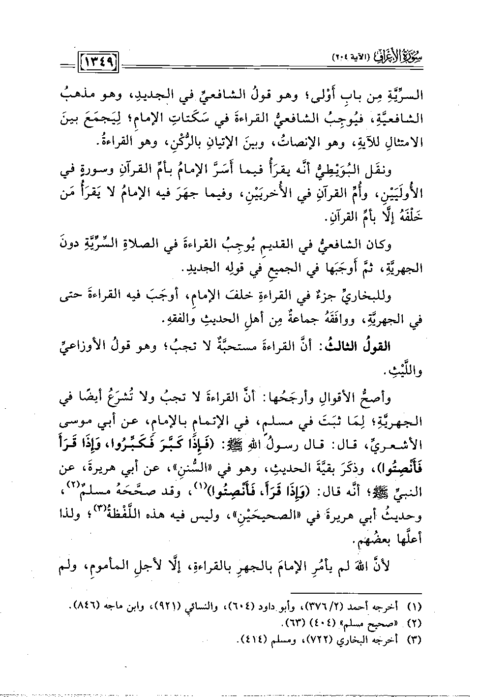 وأصحُّ الأقوالِ وأرجَحُها: أنَّ القراءةَ لا تجبُ ولا تُشرَعُ أيضًا في الجهريَّةِ؛ لِمَا ثبَتَ في مسلم، في الإتمامِ بالإمام، عن أبي موسى الأشعريّ، قال: قال رسولُ اللهِ - صلى الله عليه وسلم -: (فَإِذَا كَبَّرَ فَكَبِّرُوا، وإِذَا قَرَأَ فَأَنصِتُوا)، وذكَرَ بقيَّةَ الحديث، وهو في "السُّننِ"، عن أبي هريرةَ، عن النبيِّ - صلى الله عليه وسلم -؛ أنه قال: (وإِذَا قَرَأ، فَأَنصِتُوا) (١)، وقد صحَّحَهُ مسلمٌ (٢)، وحديثُ أبي هريرةَ في "الصحيحَيْنِ"، وليس فيه هذه اللَّفْظةُ (٣)؛ ولذا أعلَّها بعضُهم.