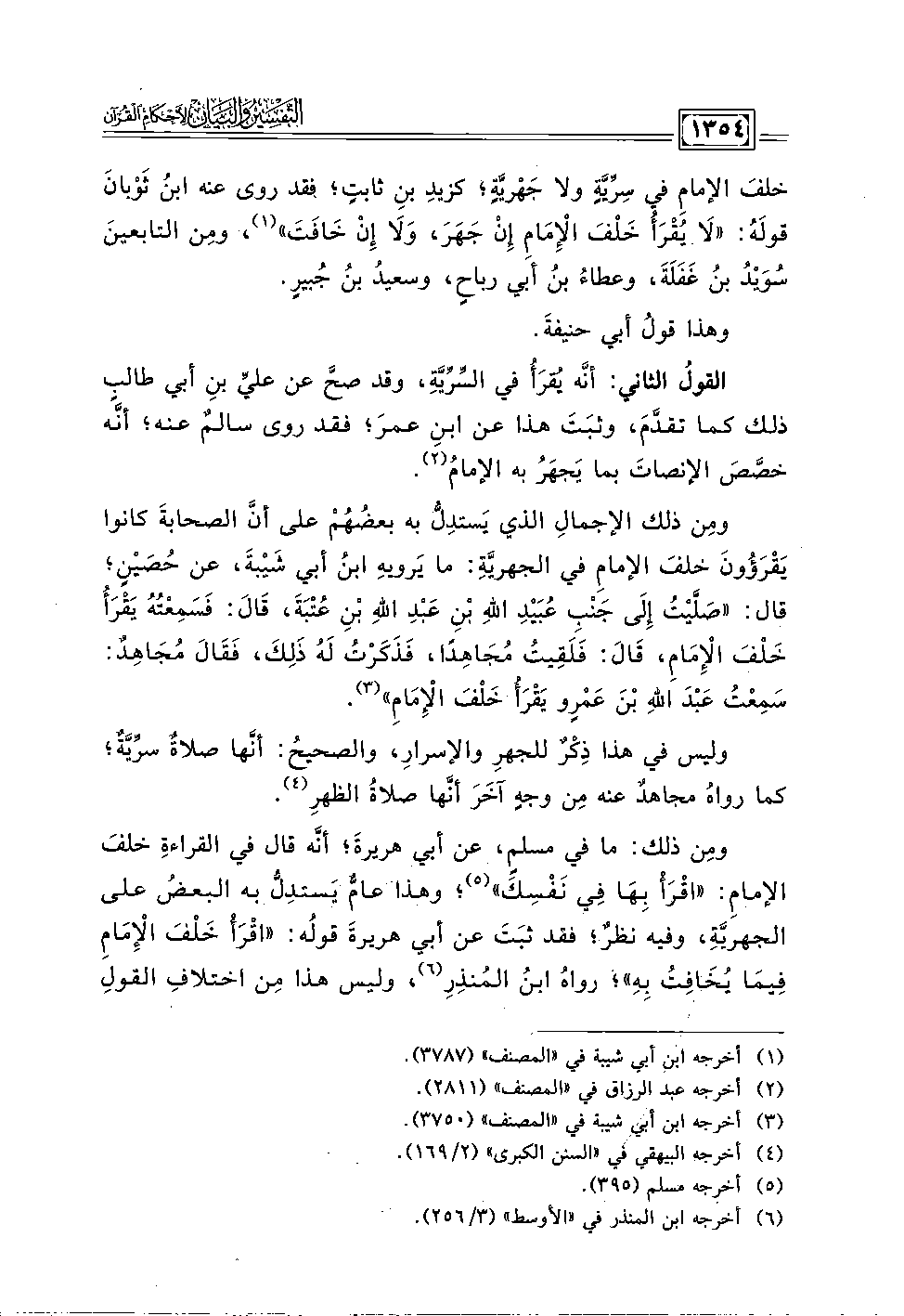 ومِن ذلك الإجمالِ الذي يَستدِلُّ به بعضُهُمْ على أنَّ الصحابةَ كانوا يَقرَؤُونَ خلفَ الإمامِ في الجهريَّةِ: ما يَرويهِ ابنُ أبي شَيبةَ، عن حُصَيْنٍ؛ قال: "صَلَّيْتُ إِلَى جَنْبِ عُبَيدِ اللهِ بْنِ عَبْدِ اللهِ بْنِ عُتْبَةَ، قَالَ: فَسَمِعْتُهُ يَقْرَأُ خَلْفَ الْإِمَام، قَالَ: فَلَقِيتُ مُجَاهِدًا، فَذَكَرتُ لَهُ ذَلِكَ، فَقَالَ مُجَاهِدٌ: سَمِعْتُ عَبْدَ اللهِ بْنَ عَمْرٍو يَقْرَأُ خَلْفَ الْإِمَامِ" (٣).