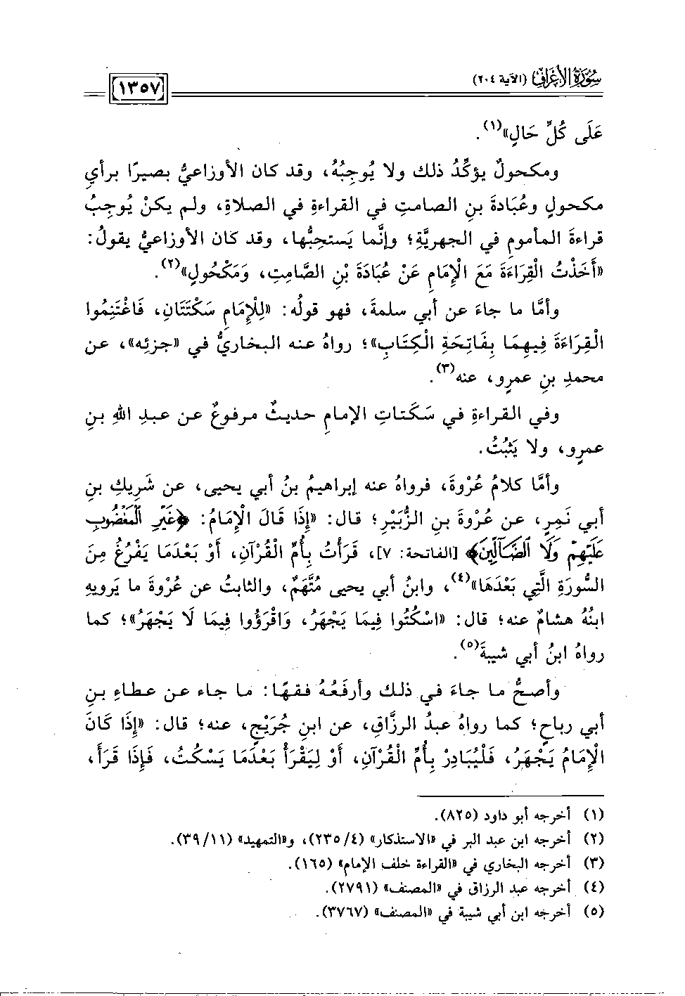 وأمَّا كلامُ عُرْوةَ، فرواهُ عنه إبراهيمُ بن أبي يحيى، عن شَرِيكِ بنِ أبي نَمِرٍ، عن عُرْوةَ بنِ الزُّبَيْرِ؛ قال: "إِذَا قَالَ الْإِمَام: {غَيْرِ الْمَغْضُوبِ عَلَيْهِمْ وَلَا الضَّالِّينَ} [الفاتحة: ٧]، قَرَأْتُ بِأُمِّ الْقُرْآن، أَو بَعْدَمَا يَفْرُغُ مِنَ السُّورَةِ الَّتِي بَعْدَهَا" (٤)، وابنُ أبي يحيى مُتَّهَمٌ، والثابتُ عن عُرْوةَ ما يَرويهِ ابنُهُ هشامٌ عنه؛ قال: "اسْكُتُوا فِيمَا يَجْهَرُ، وَاقْرَؤُوا فِيمَا لَا يَجْهَرُ"؛ كما رواهُ ابن أبي شيبةَ (٥).
