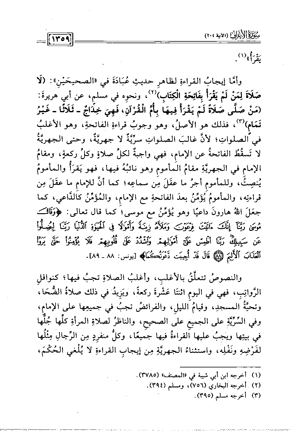 وأمَّا إيجابُ القراءةِ لظاهرِ حديثِ عُبَادَةَ في "الصحيحَيْنِ": (لَا صَلَاةَ لِمَنْ لَمْ يَقْرَأْ بِفَاتِحَةِ الْكِتَابِ) (٢)، ونحوِه في مسلمٍ، عن أبي هريرةَ: (مَنْ صَلَّى صَلَاةً لَمْ يَقْرَأْ فِيهَا بِأُمِّ الْقُرْآن، فَهِيَ خِدَاجٌ - ثَلَاثا - غَيْرُ تَمَامٍ) (٣)، فذلك هو الأصلُ، وهو وجوبُ قراءةِ الفاتحة، وهو الأغلبُ في الصلواتِ؛ لأنَّ غالبَ الصلواتِ سرِّيَّةٌ لا جهريَّةٌ، وحتى الجهريَّةُ لا تَسقُطُ الفاتحةُ عن الإمام، فهي واجبةٌ لكلِّ صلاةٍ وكلِّ ركعةٍ، ومقامُ الإمامِ في الجهريَّةِ مقامُ المَأمومِ وهو نائبُهُ فيها، فهو يَقرَأُ والمأمومُ يُنصِتُ، وللمأمومِ أجرُ ما عقَلَ مِن سماعِه؛ كما أنَّ للإمامِ ما عقَلَ مِن قراءتِه، والمأمومُ يُؤَمِّنُ بعدَ الفاتحةِ مع الإمام، والمُؤَمِّنُ كالدَّاعي، كما جعَلَ اللهُ هارونَ داعيًا وهو يُؤَمِّنُ مع موسى؛ كما قال تعالى: {وَقَالَ مُوسَى رَبَّنَا إِنَّكَ آتَيْتَ فِرْعَوْنَ وَمَلَأَهُ زِينَةً وَأَمْوَالًا فِي الْحَيَاةِ الدُّنْيَا رَبَّنَا لِيُضِلُّوا عَنْ سَبِيلِكَ رَبَّنَا اطْمِسْ عَلَى أَمْوَالِهِمْ وَاشْدُدْ عَلَى قُلُوبِهِمْ فَلَا يُؤْمِنُوا حَتَّى يَرَوُا الْعَذَابَ الْأَلِيمَ (٨٨) قَالَ قَدْ أُجِيبَتْ دَعْوَتُكُمَا} [يونس: ٨٨ - ٨٩].
