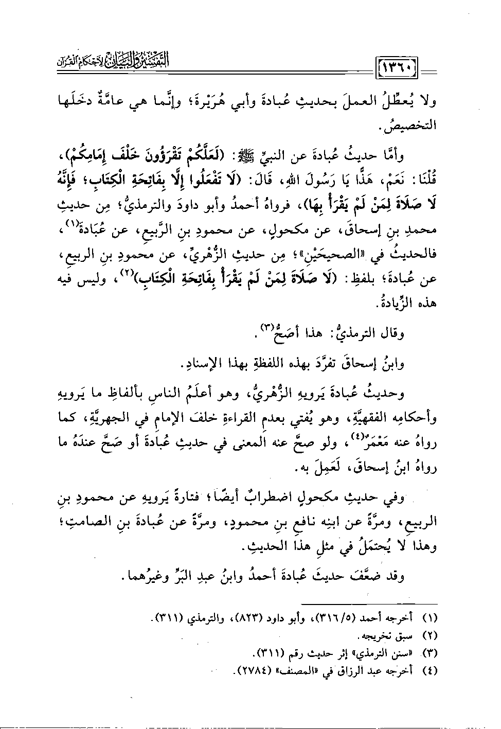 وأمَّا حديثُ عُبادةَ عن النبيِّ - صلى الله عليه وسلم -؛ (لَعَلَّكمْ تَقْرَؤُونَ خَلْفَ إِمَامِكُمْ)، قُلْنَا: نَعَمْ، هَذًّا يَا رَسُولَ الله، قَالَ: (لَا تَفْعَلُوا إِلَّا بِفَاتِحَةِ الْكِتَابِ؛ فَإِنَّه لَا صَلَاةَ لِمَنْ لَمْ يَقْرَأْ بِهَا)، فرواهُ أحمدُ وأبو داودَ والترمذيُّ؛ مِن حديثِ محمدِ بنِ إسحاقَ، عن مكحولٍ، عن محمودِ بنِ الرَّبيع، عن عُبَادةَ (١)، فالحديثُ في "الصحيحَيْنِ"؛ مِن حديثِ الزُّهْريّ، عن محمودِ بنِ الربيع، عن عُبادةَ؛ بلفظِ: (لَا صَلَاةَ لِمَنْ يَقْرَأْ بِفَاتِحَةِ الْكَتَابِ) (٢)، وليس فيه هذه الزِّيادةُ.