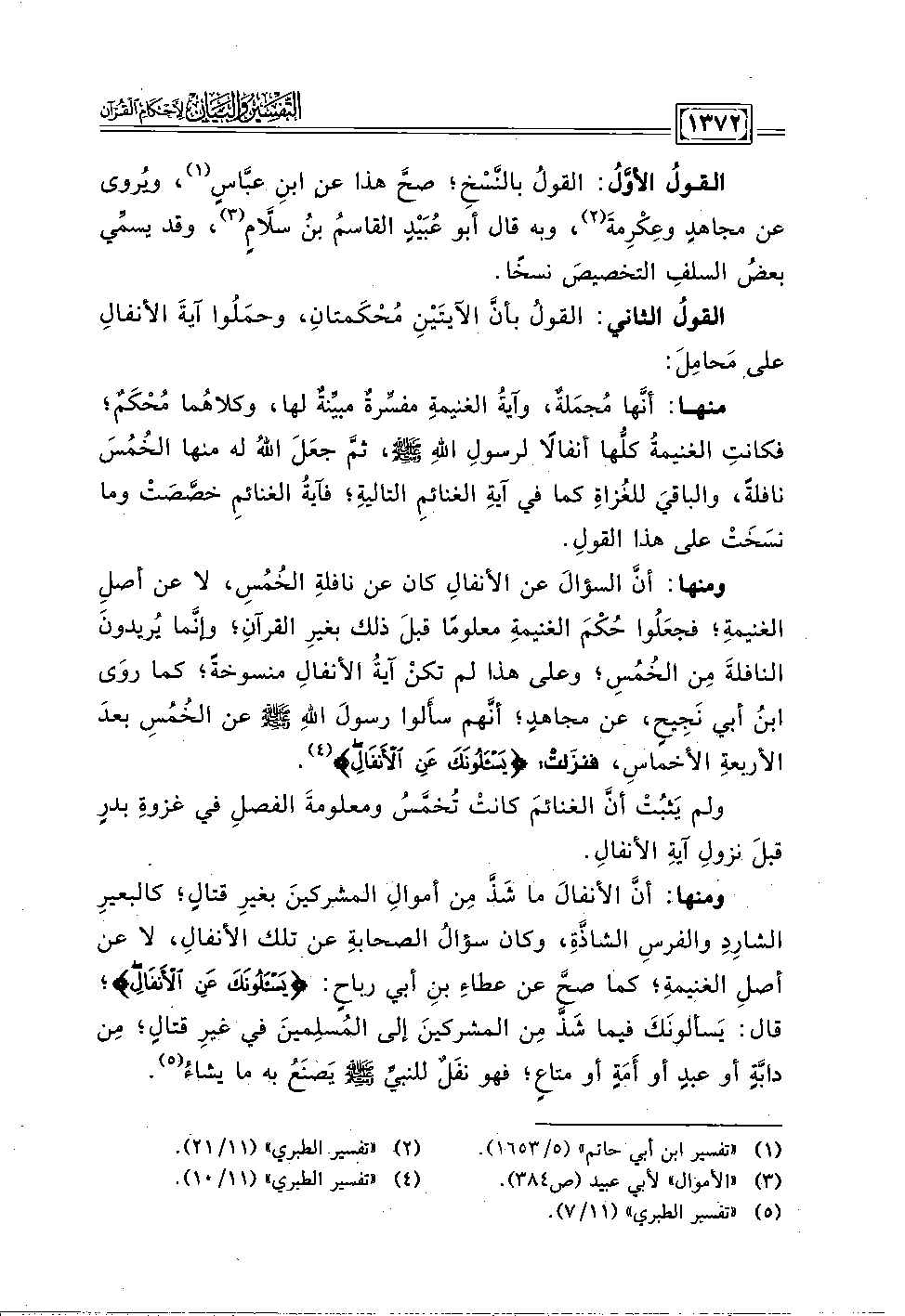 ومنها: أنَّ السؤالَ عن الأنفالِ كان عن نافلةِ الخُمُس، لا عن أصلِ الغنيمةِ؛ فجعَلُوا حُكْمَ الغنيمةِ معلومًا قبلَ ذلك بغيرِ القرآنِ؛ وإنَّما يُريدونَ النافلةَ مِن الخُمُسِ؛ وعلى هذا لم تكنْ آيةُ الأنفالِ منسوخةً؛ كما روَى ابنُ أبي نَجِيحٍ، عن مجاهدٍ؛ أنَّهم سأَلوا رسولَ اللهِ - صلى الله عليه وسلم - عن الخُمُسِ بعدَ الأربعةِ الأخماس، فنزَلتْ: {يَسْأَلُونَكَ عَنِ الْأَنْفَالِ} (٤).