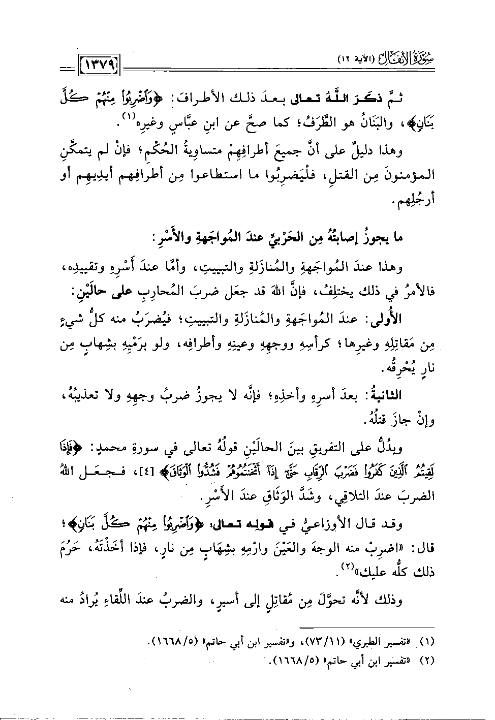 وقد قال الأوزاعيُّ في قوله تعالى: {وَاضْرِبُوا مِنْهُمْ كُلَّ بَنَانٍ}؛ قال: "اضرِبْ مه الوجهَ والعَيْن وارْمِهِ بشهَابٍ مِن نارٍ، فإذا أخَذْتَهُ، حَرُمَ ذلك كله عليك" (٢).