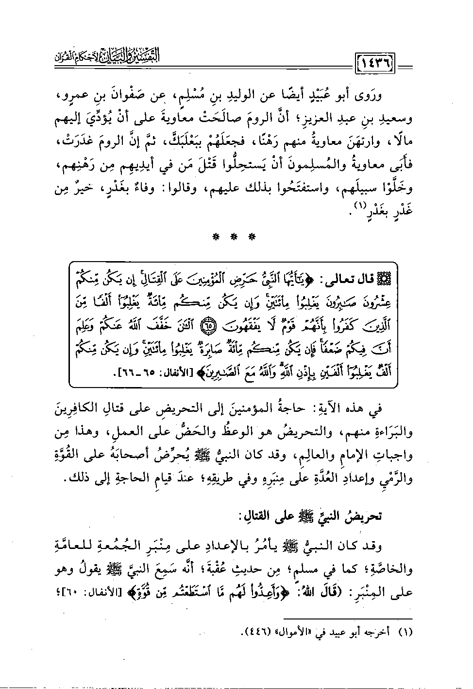 قال تعالى: {يَاأَيُّهَا النَّبِيُّ حَرِّضِ الْمُؤْمِنِينَ عَلَى الْقِتَالِ إِنْ يَكُنْ مِنْكُمْ عِشْرُونَ صَابِرُونَ يَغْلِبُوا مِائَتَيْنِ وَإِنْ يَكُنْ مِنْكُمْ مِائَةٌ يَغْلِبُوا أَلْفًا مِنَ الَّذِينَ كَفَرُوا بِأَنَّهُمْ قَوْمٌ لَا يَفْقَهُونَ (٦٥) الْآنَ خَفَّفَ اللَّهُ عَنْكُمْ وَعَلِمَ أَنَّ فِيكُمْ ضَعْفًا فَإِنْ يَكُنْ مِنْكُمْ مِائَةٌ صَابِرَةٌ يَغْلِبُوا مِائَتَيْنِ وَإِنْ يَكُنْ مِنْكُمْ أَلْفٌ يَغْلِبُوا أَلْفَيْنِ بِإِذْنِ اللَّهِ وَاللَّهُ مَعَ الصَّابِرِينَ (٦٦)} [الأنفال: ٦٥ - ٦٦].