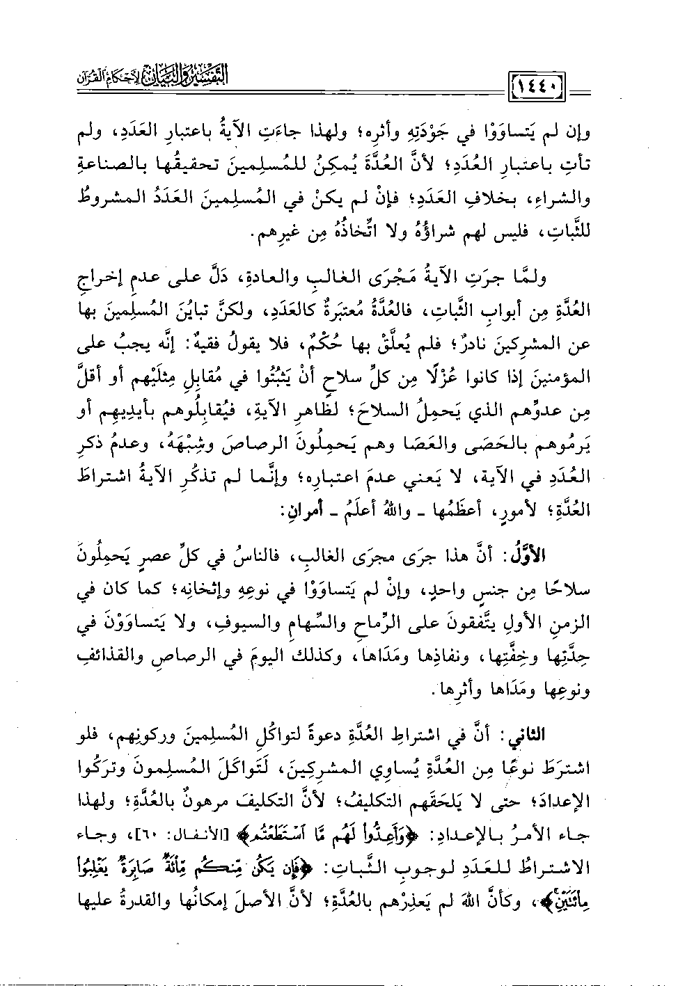 الثاني: أنَّ في اشتراطِ العُدَّةِ دعوةً لتواكُلِ المُسلِمينَ وركونِهم، فلو اشترَطَ نوعًا مِن العُدَّةِ يُساوِي المشرِكِينَ، لَتَواكَلَ المُسلِمونَ وترَكُوا الإعدادَ؛ حتى لا يَلحَقَهم التكليفُ؛ لأنَّ التكليفَ مرهونٌ بالعُدَّةِ؛ ولهذا جاء الأمرُ بالأعدادِ: {وَأَعِدُّوا لَهُمْ مَا اسْتَطَعْتُمْ} [الأنفال: ٦٠]، وجاء الاشتراطُ للعَدَدِ لوجوبِ الثَّباتِ: {فَإِنْ يَكُنْ مِنْكُمْ مِائَةٌ صَابِرَةٌ يَغْلِبُوا مِائَتَيْنِ}، وكأنَّ اللهَ لم يَعذِرْهم بالعُدَّةِ؛ لأنَّ الأصلَ إمكانُها والقدرةُ عليها