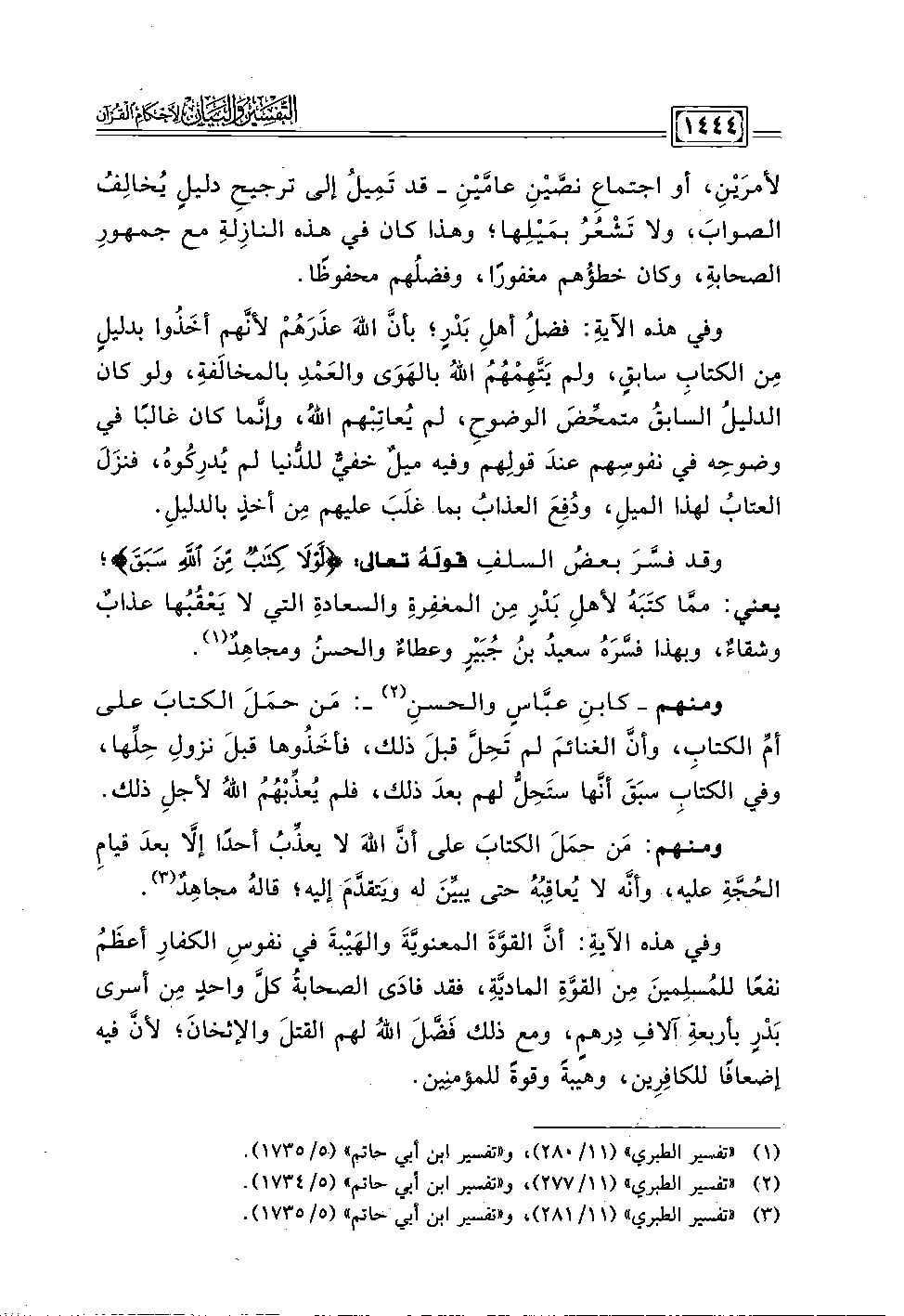 ومنهم - كابنِ عبَّاسٍ والحسنِ (٢) -: مَن حمَلَ الكتابَ على أمِّ الكتاب، وأنَّ الغنائم لم تَحِلَّ قبلَ ذلك، فأخَذُوها قبلَ نزولِ حِلِّها، وفي الكتابِ سبَقَ أنها ستَحِلُّ لهم بعدَ ذلك؛ فلم يُعذِّبْهُمُ اللهُ لأجلِ ذلك.