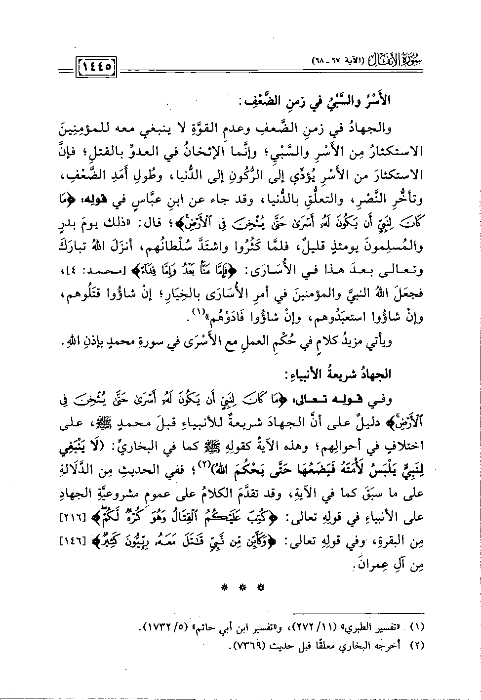 والجهادُ في زمنِ الضَّعفِ وعدمِ القوَّةِ لا ينبغي معه للمؤمِنِينَ الاستكثارُ مِن الأَسْرِ والسَّبْيِ؛ وإنَّما الإثخانُ في العدوَّ بالقتلِ؛ فإنَّ الاستكثارَ مِن الأَسْرِ يُؤدِّي إلى الرُّكُونِ إلى الدُّنيا، وطُولِ أَمَدِ الضَّعْف، وتأخُّرِ النَّصْر، والتعلُّقِ بالدُّنيا، وقد جاء عن ابنِ عبَّاسٍ في قولِه: {مَا كَانَ لِنَبِيٍّ أَنْ يَكُونَ لَهُ أَسْرَى حَتَّى يُثْخِنَ فِي الْأَرْضِ}؛ قال: "ذلك يومَ بدرٍ والمُسلِمونَ يومئذٍ قليلٌ، فلمَّا كَثُرُوا واشتَدَّ سُلْطانُهم، أنزَلَ اللهُ تبارَكَ وتعالى بعدَ هذا في الأُسَارَى: {فَإِمَّا مَنًّا بَعْدُ وَإِمَّا فِدَاءً} [محمد: ٤]، فجعَلَ اللهُ النبيَّ والمؤمنينَ في أمرِ الأُسَارَى بالخِيَارِ؛ إنْ شاؤُوا قتَلُوهم، وإنْ شاؤُوا استعبَدُوهم، وإنْ شاؤُوا فَادَوْهُم" (١).