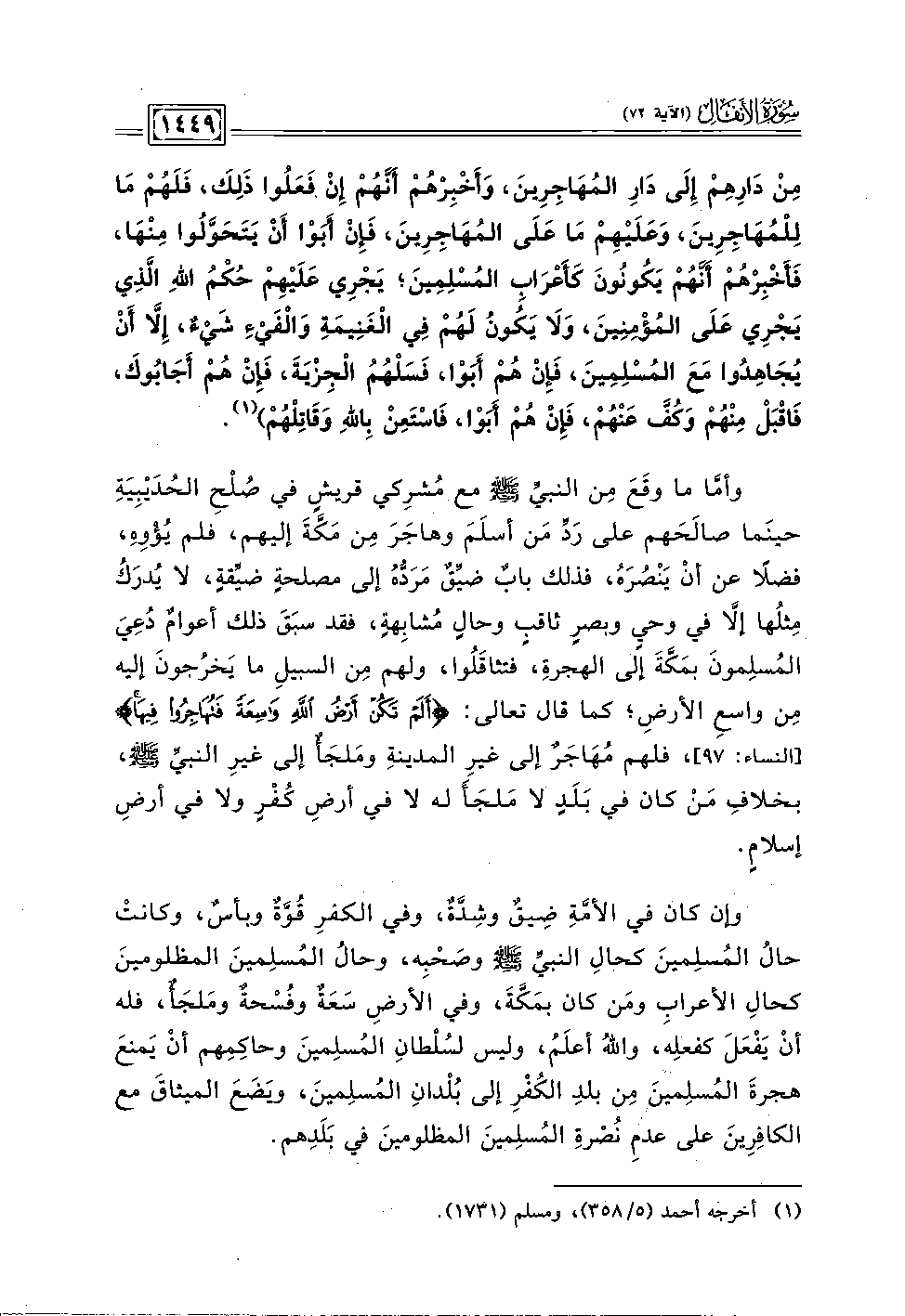 وأمَّا ما وقَعَ مِن النبيِّ - صلى الله عليه وسلم - مع مُشرِكي قريشٍ في صُلْحِ الحُدَيْبِيَةِ حينَما صالَحَهم على رَدَّ مَن أسلَمَ وهاجَرَ مِن مَكَّةَ إليهم، فلم يُؤْوِه، فضلًا عن أنْ يَنْصُرَهُ، فذلك بابٌ ضيَّقٌ مَرَدُّهُ إلى مصلحةٍ ضيَّقةٍ، لا يُدرَكُ مِثلُها إلَّا في وحيِ وبصرٍ ثاقبٍ وحالٍ مُشابِهةٍ، فقد سبَقَ ذلك أعوامٌ دُعِيَ المُسلِمونَ بمَكَّةَ إلى الهجرة، فتثاقَلُوا، ولهم مِن السبيلِ ما يَخرُجونَ إليه مِن واسعِ الأرضِ؛ كما قال تعالى: {أَلَمْ تَكُنْ أَرْضُ اللَّهِ وَاسِعَةً فَتُهَاجِرُوا فِيهَا} [النساء: ٩٧]، فلهم مُهَاجَرٌ إلى غيرِ المدينةِ ومَلجَأٌ إلى غيرِ النبيِّ - صلى الله عليه وسلم -، بخلافِ مَنْ كان لحي بَلَدٍ لا مَلجَأَ له لا في أرضِ كُفْرٍ ولا في أرضِ إسلامٍ.