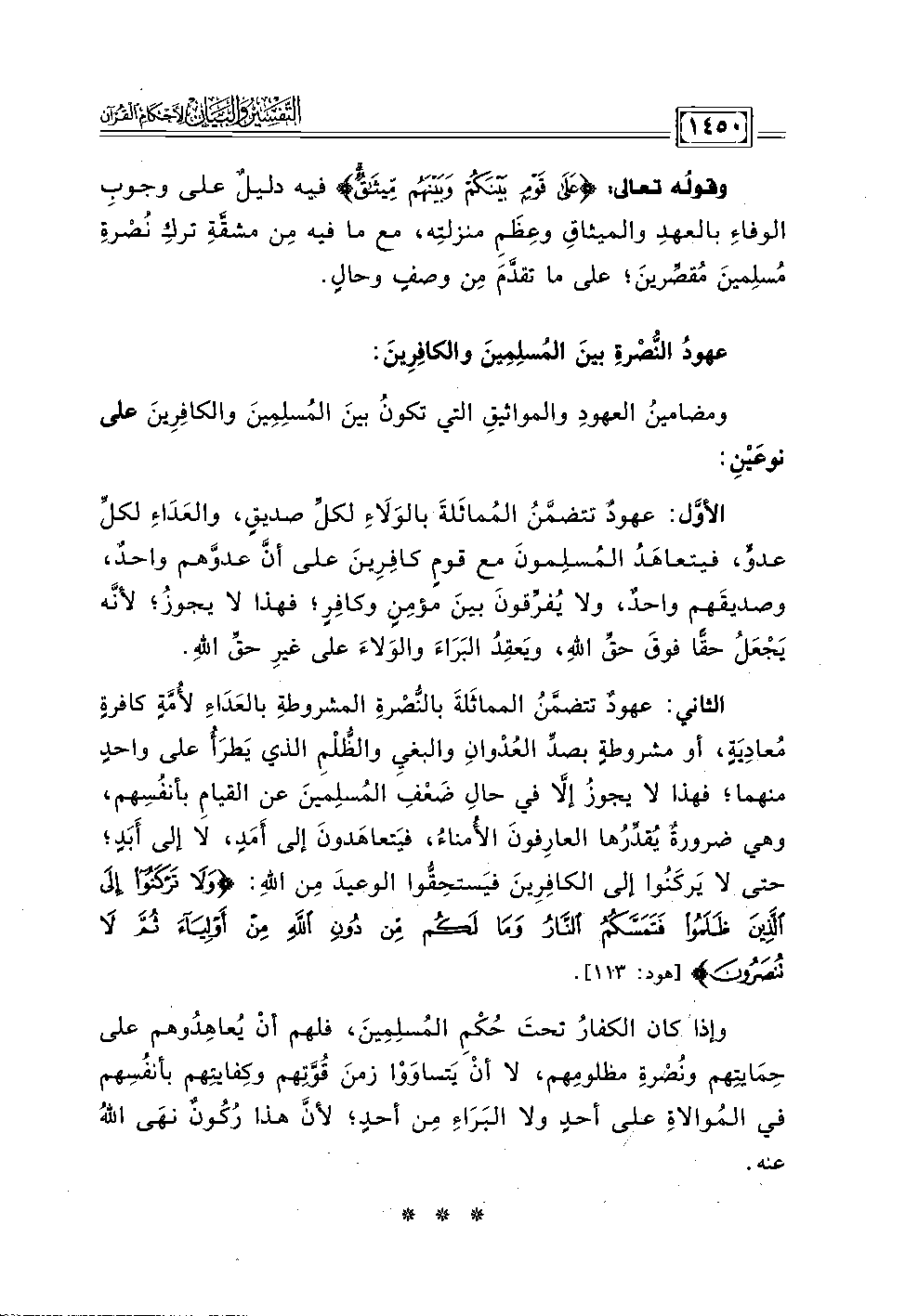الثاني: عهودٌ تتضمَّنُ المماثَلةَ بالنُّصْرةِ المشروطةِ بالعَدَاءِ لأُمَّةٍ كافرةٍ مُعادِيَةٍ، أو مشروطةٍ بصدِّ العُدْوانِ والبغيِ والظُّلْمِ الذي يَطرَأُ على واحدٍ منهما؛ فهذا لا يجوزُ إلَّا في حالِ ضَعْفِ المُسلِمينَ عن القيامِ بأنفُسِهم، وهي ضرورةٌ يُقدِّرُها العارِفونَ الأُمناءُ فيَتعاهَدونَ إلى أَمَدٍ، لا إلى أَبَدٍ؛ حتى لا يَركَنُوا إلى الكافِرِينَ فيَستحِقُّوا الوعيدَ مِن اللهِ: {وَلَا تَرْكَنُوا إِلَى الَّذِينَ ظَلَمُوا فَتَمَسَّكُمُ النَّارُ وَمَا لَكُمْ مِنْ دُونِ اللَّهِ مِنْ أَوْلِيَاءَ ثُمَّ لَا تُنْصَرُونَ (١١٣)} [هود: ١١٣].