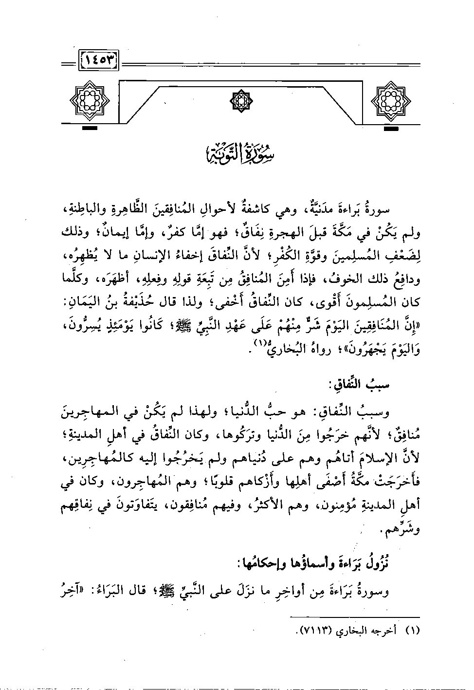 سورةُ بَراءةَ مدَنيَّةٌ، وهي كاشفةٌ لأحوالِ المُنافِقينَ الظَّاهِرةِ والباطِنة، ولم يَكُنْ في مَكَةَ قبلَ الهجرةِ نِفَاقٌ؛ فهو إمَّا كفرٌ، وإمَّا إيمانٌ؛ وذلك لِضَعْفِ المُسلِمينَ وقوَّةِ الكُفرِ؛ لأنَّ النِّفاقَ إخفاءُ الإنسانِ ما لا يًظهِرُه، ودافِعُ ذلك الخوفُ، فإذا أمِنَ المُنافِقُ مِن تَبِعَةِ قولِهِ وفِعلِه، أظهَرَه، وكلَّما كان المُسلِمونَ أَقْوى، كان النِّفاق أَخْفى؛ ولذا قال حُذَيْفةً بن اليَمَانِ: "إِن المُنَافِقِينَ اليَوْمَ شَرٌّ مِنْهُمْ عَلَى عَهْدِ النَّبِيِّ - صلى الله عليه وسلم -؛ كَانُوا يَوْمَئِذٍ يُسِرُّونَ، وَاليَوْمَ يَجهَرْونَ"، رواهْ البُخاريُّ (١).