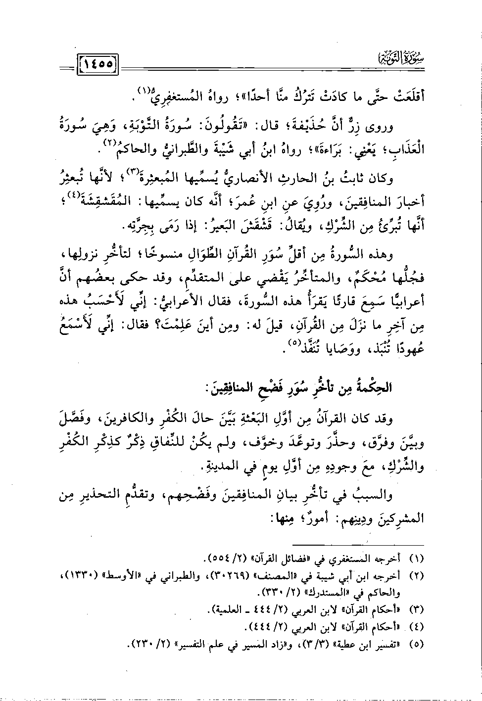وكان ثابتُ بن الحارثِ الأنصاريُّ يُسمِّيها المُبعثِرةَ (٣)؛ لأنَّها تُبعثِرُ أخبارَ المنافِقينَ، ورُوِيَ عنِ ابنِ عُمرَ؛ أنه كان يسمِّيها: المُقَشقِشةَ (٤)؛ أنَّها تُبرِّئُ مِن الشِّرْك، وَيُقالُ: قَشْقَشَ البَعيرُ: إذا رَمَى بِجِرَّتِه.