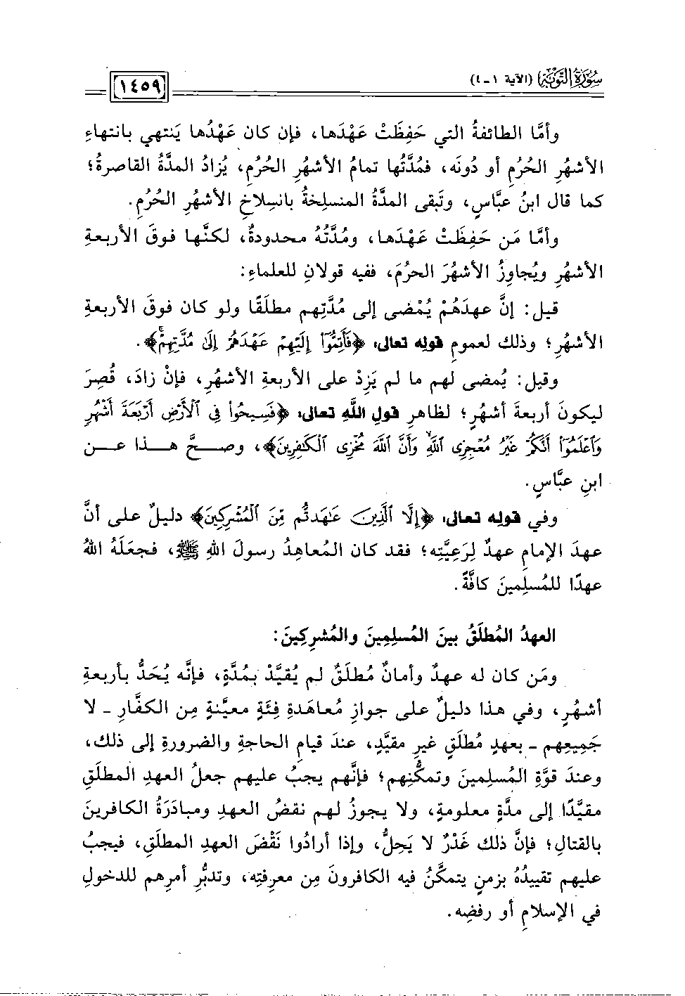 ومَن كان له عهدٌ وأمانٌ مُطلَقٌ لم يُقيَّدْ بمُدَّة، فإنَّه يُحَدُّ بأربعةِ أشهُرٍ، وفي هذا دليلٌ على جوازِ مُعاهَدةِ فِئَةِ معيَّنةٍ مِن الكفَّارِ - لا جَمِيعِهم - بعهدٍ مُطلَقِ غير مقيَّد، عندَ قيامِ الحاجةِ والضرورةِ إلى ذلك، وعندَ قوَّةِ المُسلِمينَ وتمكُّنِهم؛ فإنَّهم يجبُ عليهم جعلُ العهدِ المطلَقِ مقيَّدًا إلى مدَّةٍ معلومةٍ، ولا يجوزُ لهم نقضُ العهدِ ومبادَرَةُ الكافرينَ بالقتالِ؛ فإنَّ ذلك غَدْرٌ لا يَحِلُّ، وإذا أرادُوا نَقْضَ العهدِ المطلَق، فيجبُ عليهم تقييدُهُ بزمنٍ يتمكَّنُ فيه الكافرونَ مِن معرِفتِه، وتدبُّرِ أمرِهم للدخولِ في الإسلامِ أو رفضِه.