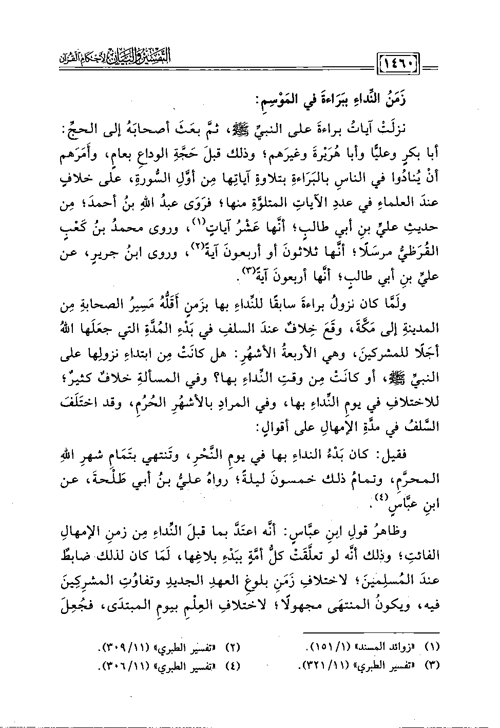ولَمَّا كان نزولُ براءةَ سابقًا للنِّداءِ بها بزَمنٍ أَقَلُّهُ مَسِيرُ الصحابةِ مِن المدينةِ إلى مَكَّةَ، وقَعَ خِلافٌ عندَ السلفِ في بَدْءِ المُدَّةِ التي جعَلَها اللهُ أجَلًا للمشركينَ، وهي الأربعةُ الأشهُرِ: هل كانَتْ مِن ابتداءِ نزولها على النبيِّ - صلى الله عليه وسلم -، أو كانَتْ مِن وقتِ النِّداءِ بها؟ وفي المسألةِ خلافٌ كثيرٌ؛ للاختلافِ في يومِ النِّداءِ بها، وفي المرادِ بالأشهُرِ الحُرُم، وقد اختَلَفَ السَّلفُ في مدَّةِ الإمهالِ على أقوالٍ: