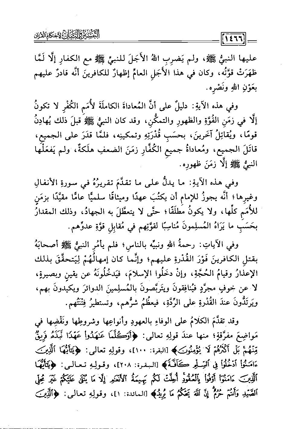 وفي هذه الآيةِ: ما يدلُّ على ما تقدّمَ تقريرُهُ في سورةِ الأنفالِ وغيرِها؛ أنه يجوزُ للإمامِ أن يكتُبَ عهدًا وميثاقًا سلميًّا عامًّا مقيَّدًا بزمَنٍ للأمَمِ كلِّها، ولا يكونُ مطلَقًا؛ حتَّى لا يتعطَّلَ به الجهادُ، وذلك المقدارُ بحَسَبِ ما يَرَاهُ المُسلِمونَ مُناسبًا لقوَّتِهم في مُقابِلِ قوَّةِ عدوِّهم.