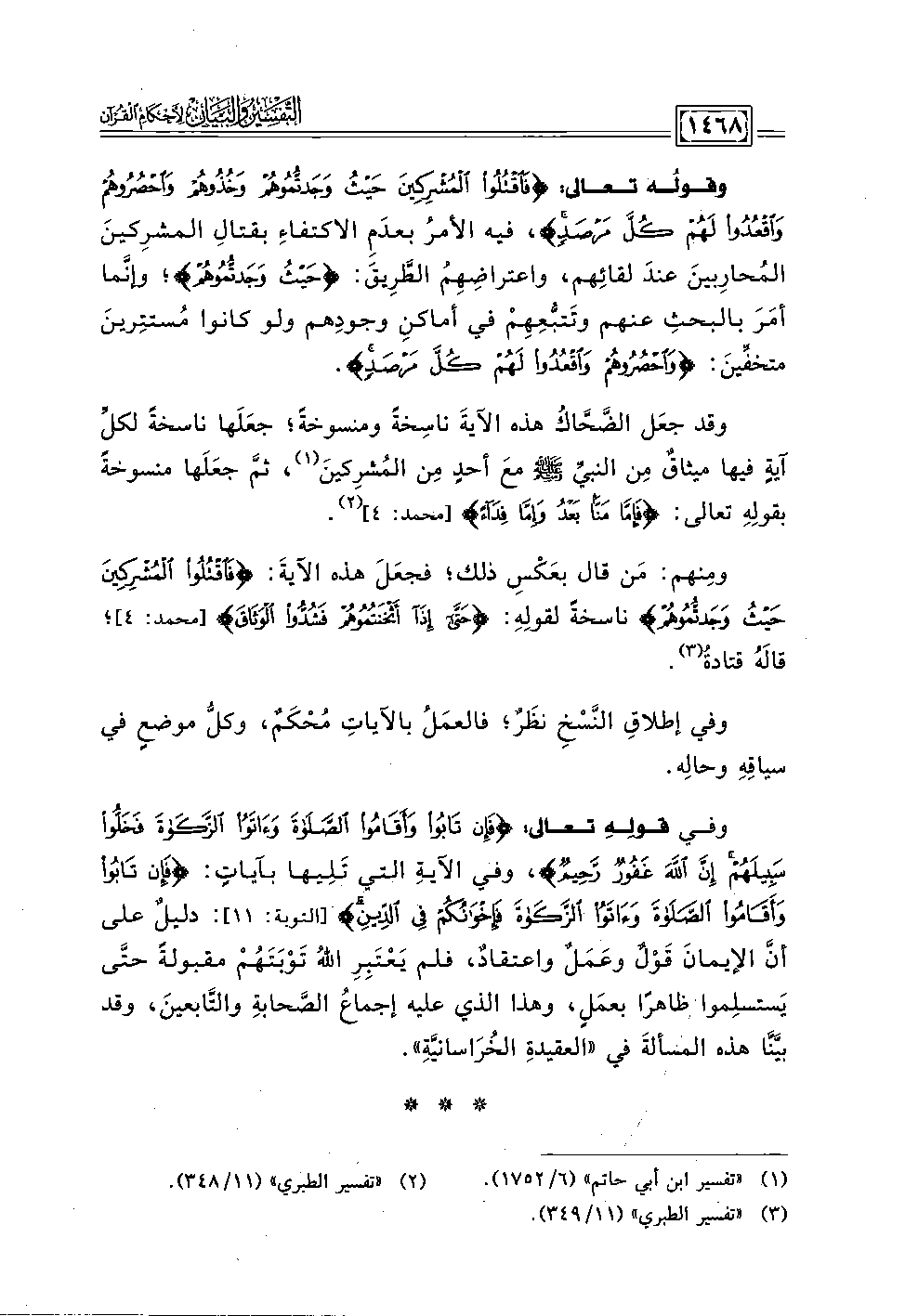 وفي قولِهِ تعالى: {فَإِنْ تَابُوا وَأَقَامُوا الصَّلَاةَ وَآتَوُا الزَّكَاةَ فَخَلُّوا سَبِيلَهُمْ إِنَّ اللَّهَ غَفُورٌ رَحِيمٌ}، وفي الآيةِ التي تَلِيِها بآياتٍ: {فَإِنْ تَابُوا وَأَقَامُوا الصَّلَاةَ وَآتَوُا الزَّكَاةَ فَإِخْوَانُكُمْ فِي الدِّينِ} [التوبة: ١١]: دليلٌ على أنَّ الإيمانَ قَوْلٌ وعَمَلٌ واعتقادٌ، فلم يَعْتَبِرِ اللهُ تَوْبَتَهُمْ مقبولةً حتَّى يَستسلِموا ظاهرًا بعمَل، وهذا الذي عليه إجماعُ الصَّحابةِ والتَّابعينَ، وقد بيَّنَّا هذه المسألةَ في "العقيدةِ الخُرَاسانيَّةِ".