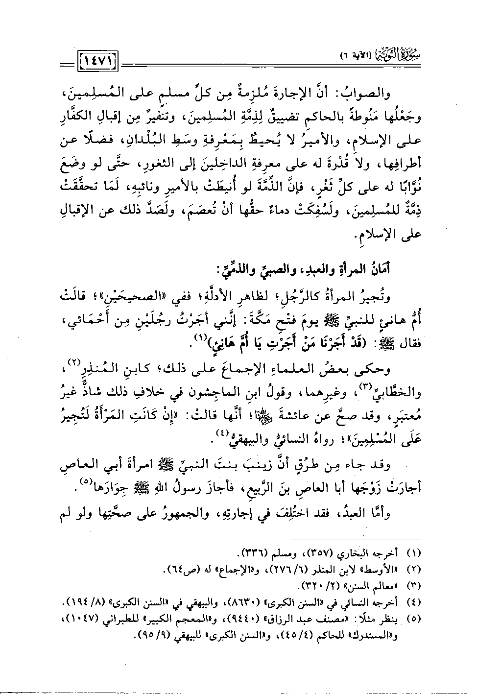 والصوابُ: أنَّ الإجارةَ مُلزِمةٌ مِن كلِّ مسلمٍ على المُسلِمينَ، وجَعْلُها مَنُوطة بالحاكمِ تضييقٌ لِذِمَّةِ المُسلِمينَ، وتنفيرٌ مِن إقبالِ الكفَّارِ على الإسلام، والأميرُ لا يُحيطُ بِمَعْرِفةِ وسَطِ البُلْدان، فضلًا عن أطرافِها، ولا قُدْرةَ له على معرِفةِ الداخِلينَ إلى الثغور، حتَّى لو وضَعَ نُوَّابًا له على كلِّ ثَغْرٍ، فإنَّ الذِّمَّةَ لو أُنيطَتْ بالأميرِ ونائبِه، لَمَا تحقَّقَتْ ذِمَّةٌ للمُسلِمينَ، ولَسُفِكَتْ دماءٌ حقُّها أن تُعصَمَ، ولَصَدَّ ذلك عن الإقبالِ على الإسلامِ.