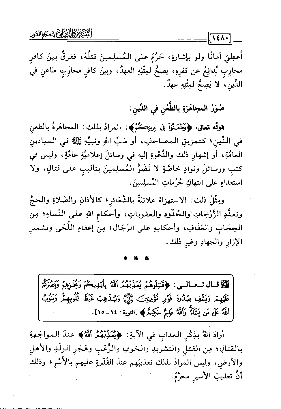 قولُه تعالى: {وَطَعَنُوا فِي دِينِكُمْ}: المراد بذلك: المجاهَرةُ بالطعنِ في الدِّينِ؛ كتمزيقِ المصاحف، أو سَبِّ اللهِ ونبيِّهِ - صلى الله عليه وسلم - في الميادينِ العامَّة، أو إشهارِ ذلك والدَّعْوةِ إليه في وسائلَ إعلاميَّةٍ عامَّةٍ، وليس في كتبٍ ورسائلَ ونوادٍ خاصَّةٍ لا تَضُرُّ المُسلِمينَ بتأليبٍ على قتالٍ، ولا استعداءٍ على انتهاكِ حُرُماتِ المُسلِمينَ.