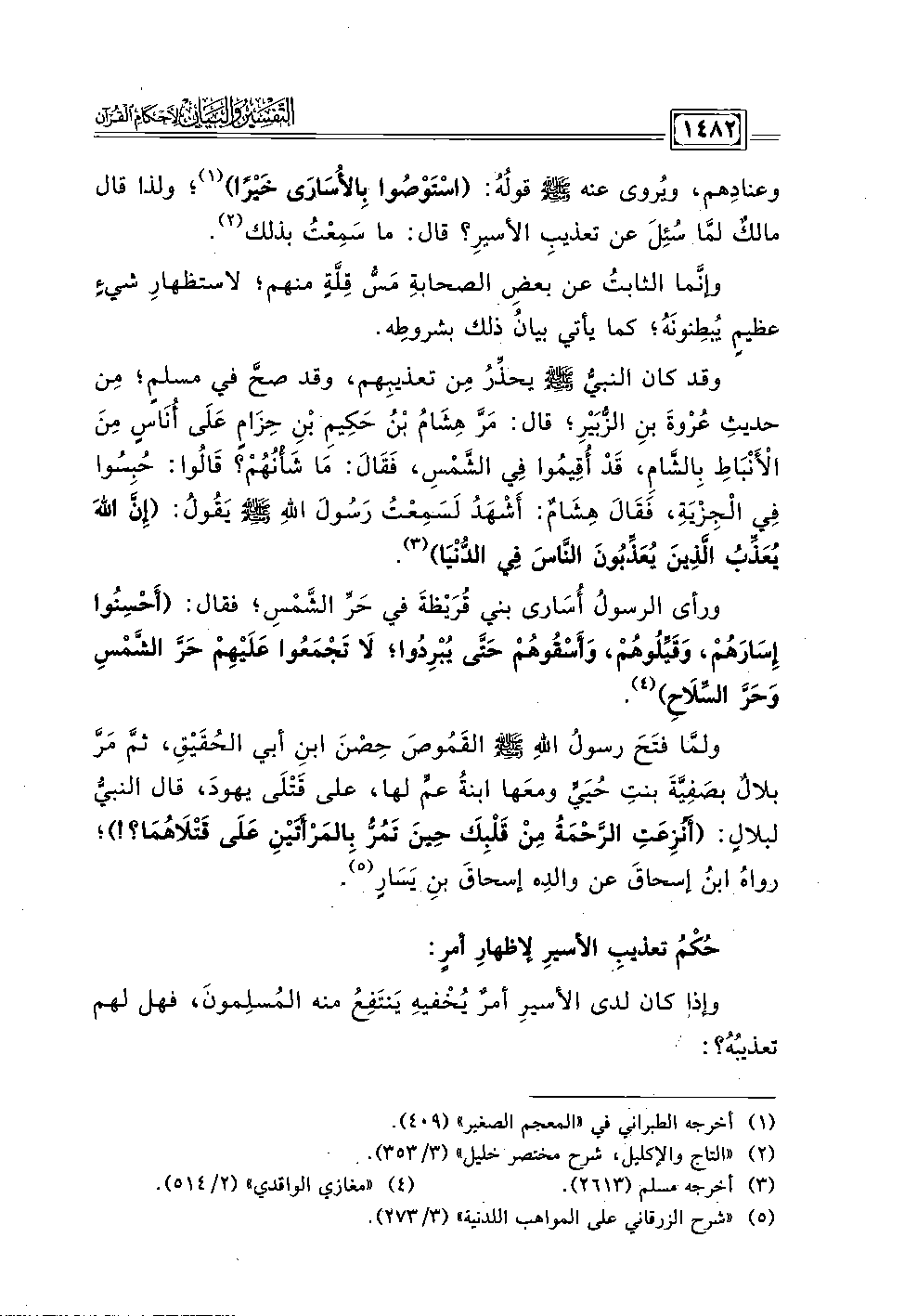 وقد كان النبيُّ - صلى الله عليه وسلم - يحذِّرُ مِن تعذيبِهم، وقد صحَّ في مسلمٍ؛ مِن حديثِ عُرْوةَ بنِ الزُّبَيْرِ؛ قال: مَرَّ هِشَامُ بْنُ حَكِيمِ بْنِ حِزَامٍ عَلَى أُنَاسٍ مِنَ الْأَنْبَاطِ بِالشَّام، قَدْ أُقِيمُوا فِي الشَّمْس، فَقَالَ: مَا شأْنُهُمْ؟ قَالُوا: حُبِسُوا فِي الْجِزْيَة، فَقَالَ هِشَامٌ: أَشْهَدُ لَسَمِعْتُ رَسُولَ اللهِ - صلى الله عليه وسلم - يَقُولُ: (إِنَّ اللهَ يُعَذِّبُ الَّذِينَ يُعَذِّبُونَ النَّاسَ فِي الدُّنْيَا) (٣).