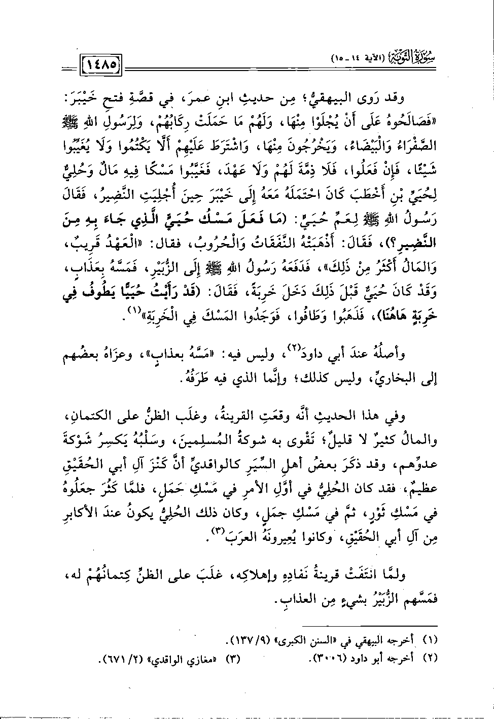 وقد رَوى البيهقيُّ؛ مِن حديثِ ابنِ عمرَ، في قصَّةِ فتحِ خَيْبَرَ: "فَصَالَحُوهُ عَلَى أَنْ يُجْلَوْا مِنْهَا، وَلَهُمْ مَا حَمَلَتْ رِكَابُهُمْ، وَلرَسُولِ اللهِ - صلى الله عليه وسلم - الصَّفْرَاءُ وَالْبَيْضَاءُ، وَيَخْرُجُونَ مِنْهَا، وَاشْتَرَطَ عَلَيْهِمْ أَلَّا يَكْتُمُوا وَلَا يُغَيِّبُوا شَيْئًا، فَإِنْ فَعَلُوا، فَلَا ذِمَّةَ لَهُمْ وَلَا عَهْدَ، فَغَيَّبُوا مَسْكًا فِيهِ مَالٌ وَحُلِيٌّ لِحُيَيِّ بْنِ أَخْطَبَ كَانَ احْتَمَلَهُ مَعَهُ إِلَى خَيْبَرَ حِينَ أُجْلِيَتِ النَّضِيرُ، فَقَالَ رَسُولُ اللهِ - صلى الله عليه وسلم - لِعَمِّ حُيَيٍّ: (مَا فَعَلَ مَسْكُ حُيَيٍّ الَّذِي جَاءَ بِهِ مِنَ النَّضِيرِ؟ )، فَقَالَ: أَذْهَبَتْهُ النَّفَقَاتُ وَالْحُرُوبُ، فقال: "الْعَهْدُ قَرِيبٌ، وَالمَالُ أَكْثَرُ مِنْ ذَلِكَ"، فَدَفَعَهُ رَسُولُ اللهِ - صلى الله عليه وسلم - إِلَى الزُّبَيْر، فَمَسَّهُ بِعَذَابٍ، وَقَدْ كَانَ حُيَيٌّ قَبْلَ ذَلِكَ دَخَلَ خَرِبَةً، فَقَالَ: (قَدْ رَأَيْتُ حُيَيًّا يَطُوفُ فِي خَرِبَةٍ هَاهُنَا)، فَذَهَبُوا وَطَافُوا، فَوَجَدُوا المَسْكَ فِي الْخَرِبَةِ" (١).