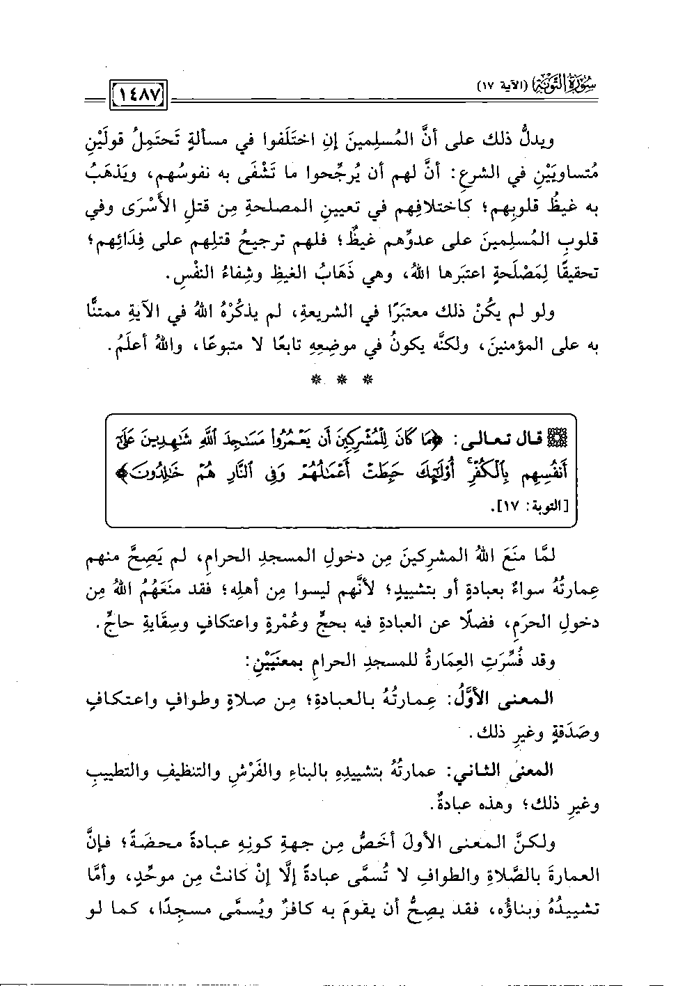 لمَّا منَعَ اللهُ المشرِكينَ مِن دخولِ المسجدِ الحرام، لم يَصِحَّ منهم عِمارتُهُ سواءٌ بعبادةٍ أو بتشييدٍ؛ لأنَّهم ليسوا مِن أهلِه؛ فقد منَعَهُمُ اللهُ مِن دخولِ الحرَم، فضلًا عن العبادةِ فيه بحجٍّ وعُمْرةٍ واعتكافٍ وسِقَايةِ حاجِّ.
