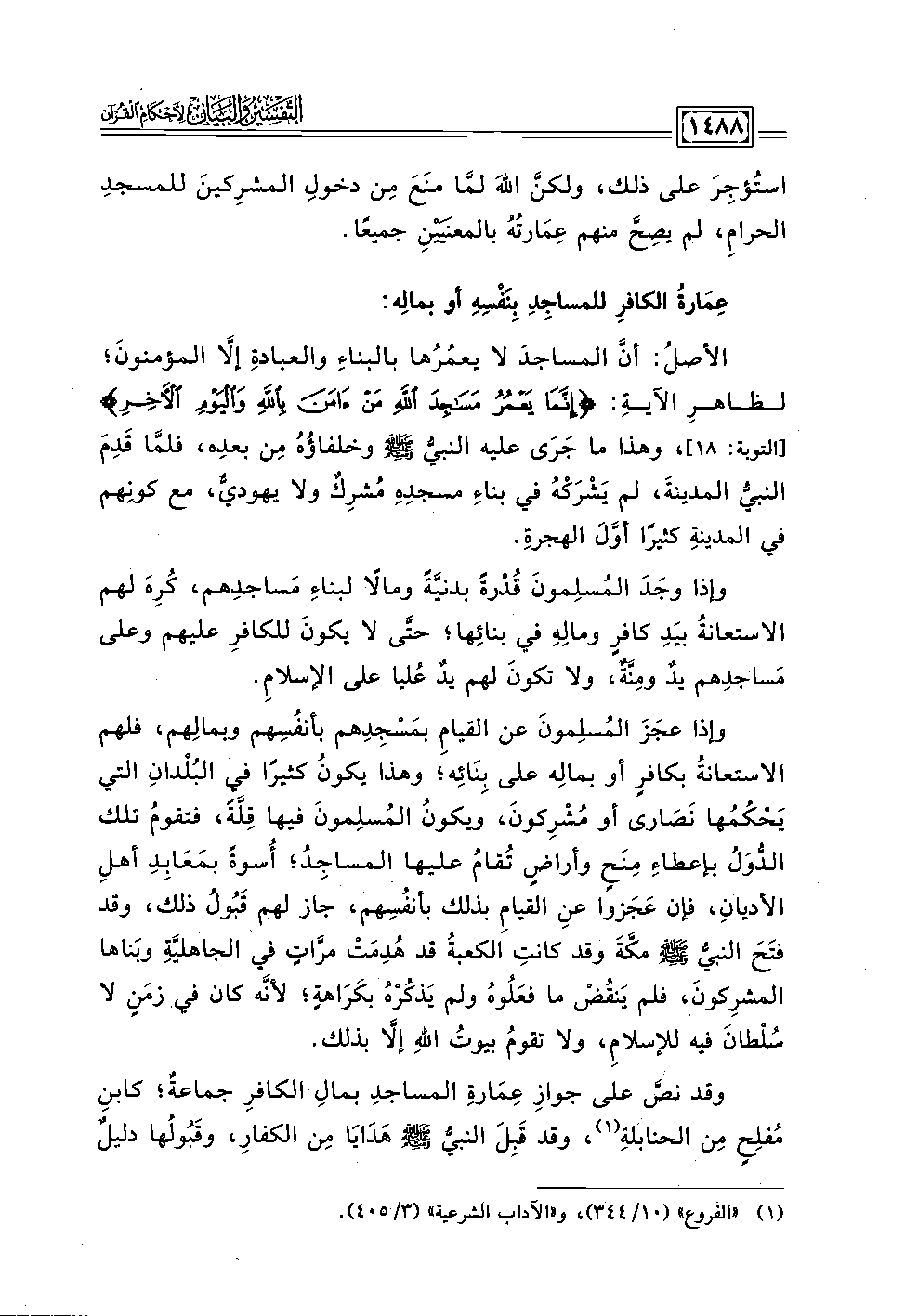 وقد نصَّ على جوازِ عِمَارةِ المساجدِ بمالِ الكافرِ جماعةٌ؛ كابنِ مُفلِحٍ مِن الحنابلةِ (١)، وقد قَبِلَ النبيُّ - صلى الله عليه وسلم - هَدَايَا مِن الكفار، وقَبُولُها دليلٌ