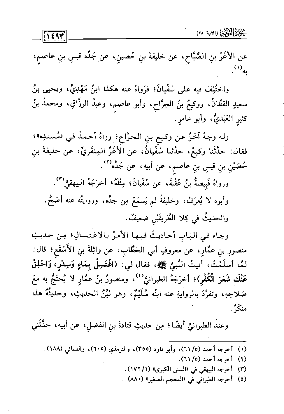 وجاء في البابِ أحاديثُ فيها الأمرُ بالاغتسالِ؛ مِن حديثِ منصورِ ينِ عمَّارٍ، عن معروفٍ أبي الخطَّاب، عن واثِلةَ بنِ الأَسْقَعِ؛ قال: لمَّا أسلَمْتُ، أتيتُ النَّبيَّ - صلى الله عليه وسلم -، فقال لي: (اغْتَسِلْ بِمَاءٍ وَسِدْرٍ، وَاحْلِقْ عَنْكَ شَعَرَ الْكُفْرِ)؛ أخرَجَهُ الطبرانيُّ (٤)، ومنصورُ بن عمَّارٍ لا يُحتَجُّ به معَ صَلاحِه، وتفرَّدَ بالروايةِ عنه ابنُه سُلَيْمٌ، وهو ليِّنُ الحديث، وحديثُهُ هذا منكَرٌ.