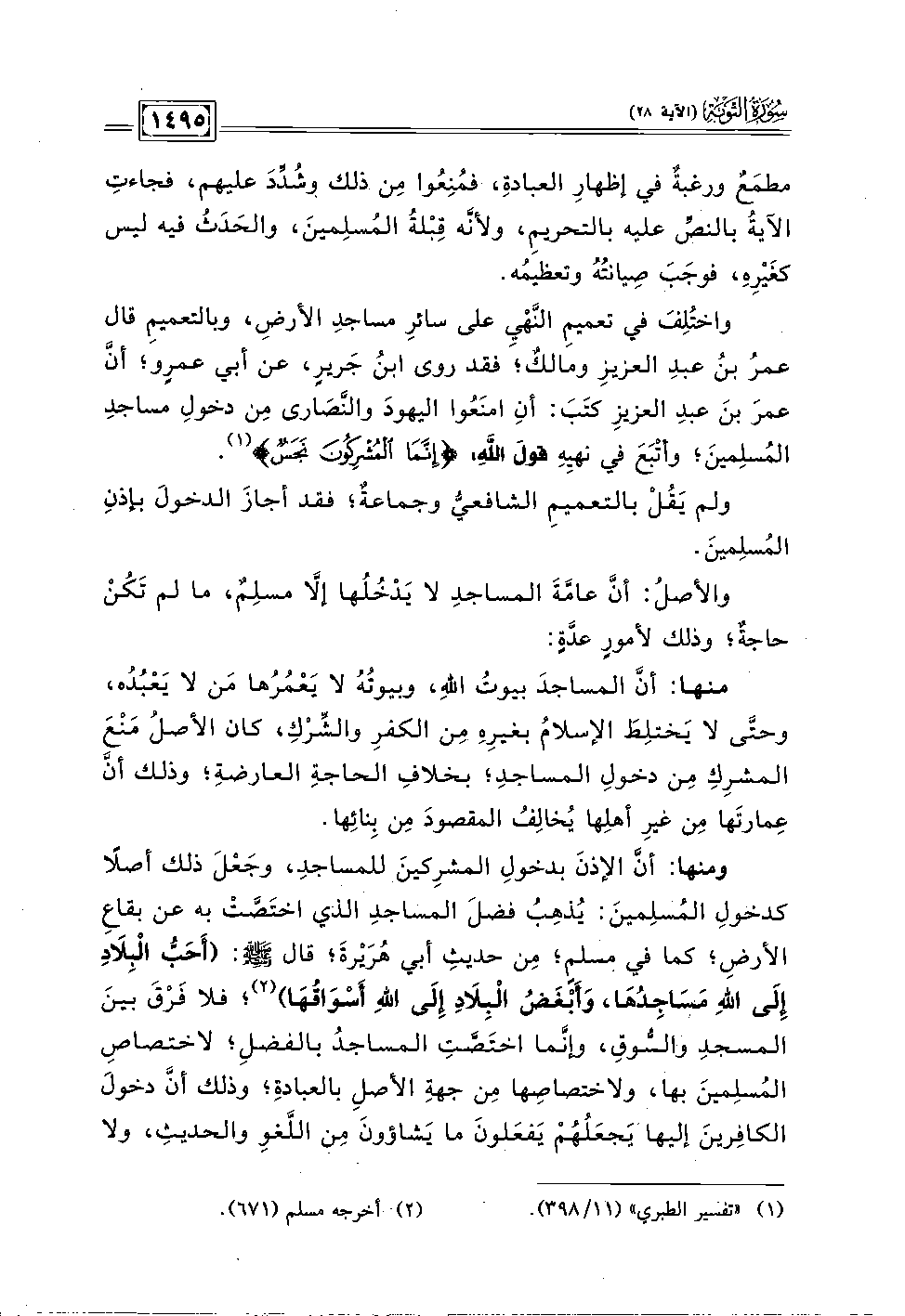 واختُلِفَ في تعميمِ النَّهْيِ على سائرِ مساجدِ الأرض، وبالتعميم قال عمرُ بن عبد العزيرِ ومالكٌ فقد روى ابنُ جَريرٍ، عن أبي عمروٍ؛ أنَّ عمرَ بنَ عبد العزيزِ كتَب: أنِ امنَعُوا اليهودَ والنَّصَارى مِن دخولِ مساجدِ المُسلِمينَ، وأتْبَعَ في نهيِهِ قولَ اللَّهِ: {إِنَّمَا الْمُشْرِكُونَ نَجَسٌ} (١).
