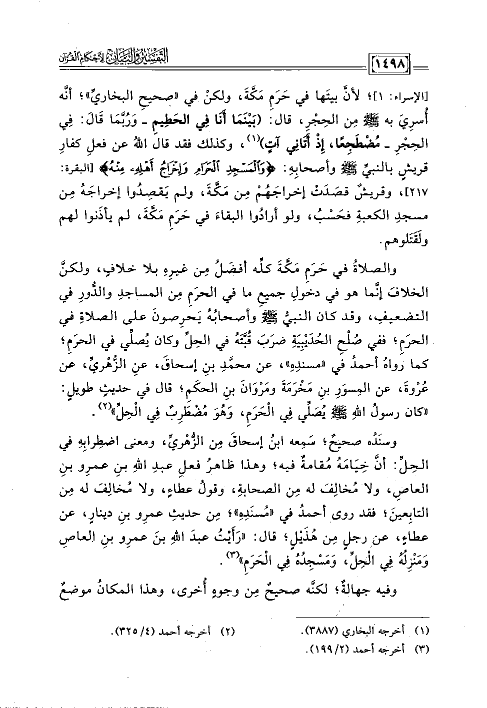 [الإسراء: ١]؛ لأنَّ بيتَها في حَرَمِ مَكَّةَ، ولكنْ في "صحيحِ البخاريَّ"؛ أنه أُسرِيَ به - صلى الله عليه وسلم - مِن الحِجْر، قال: (بَيْنَمَا أَنَا فِي الحَطِيمِ - وَرُبَّمَا قَالَ: فِي الحِجْرِ - مُضْطَجِعًا، إِذْ أَتَانِي آتٍ) (١)، وكذلك ففد قال اللهُ عن فحلِ كفارِ قريشٍ بالنبيِّ - صلى الله عليه وسلم - وأصحابِهِ: {وَالْمَسْجِدِ الْحَرَامِ وَإِخْرَاجُ أَهْلِهِ مِنْهُ} [البقرة: ٢١٧]، وقريشٌ قصَدَتْ إخراحَهُمْ مِن مَكَّةَ، ولم يَقصِدُوا إخراجَهُ مِن مسجدِ الكعبةِ فحَسْبُ، ولو أرادُوا البقاءَ في حَرَمِ مَكَّةَ، لم يأذَنوا لهم ولَقَتَلوهم.