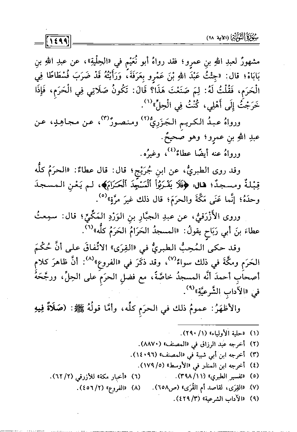 وقد حكى المُحِبُّ الطبريُّ في "القِرَى" الاتِّفاقَ على أنَّ حُكْمَ الحَرَمِ ومكَّةَ في ذلك سواءٌ: (٧)، وقد ذكَرَ في "الفروعِ" (٨): أنَّ ظاهرَ كلامِ أصحابِ أحمدَ أنه المسجدُ خاصَّةً، مع فضلِ الحرَمِ على الحِلّ، ورجَّحَهُ في "الآدابِ الشَّرعيَّةِ" (٩).