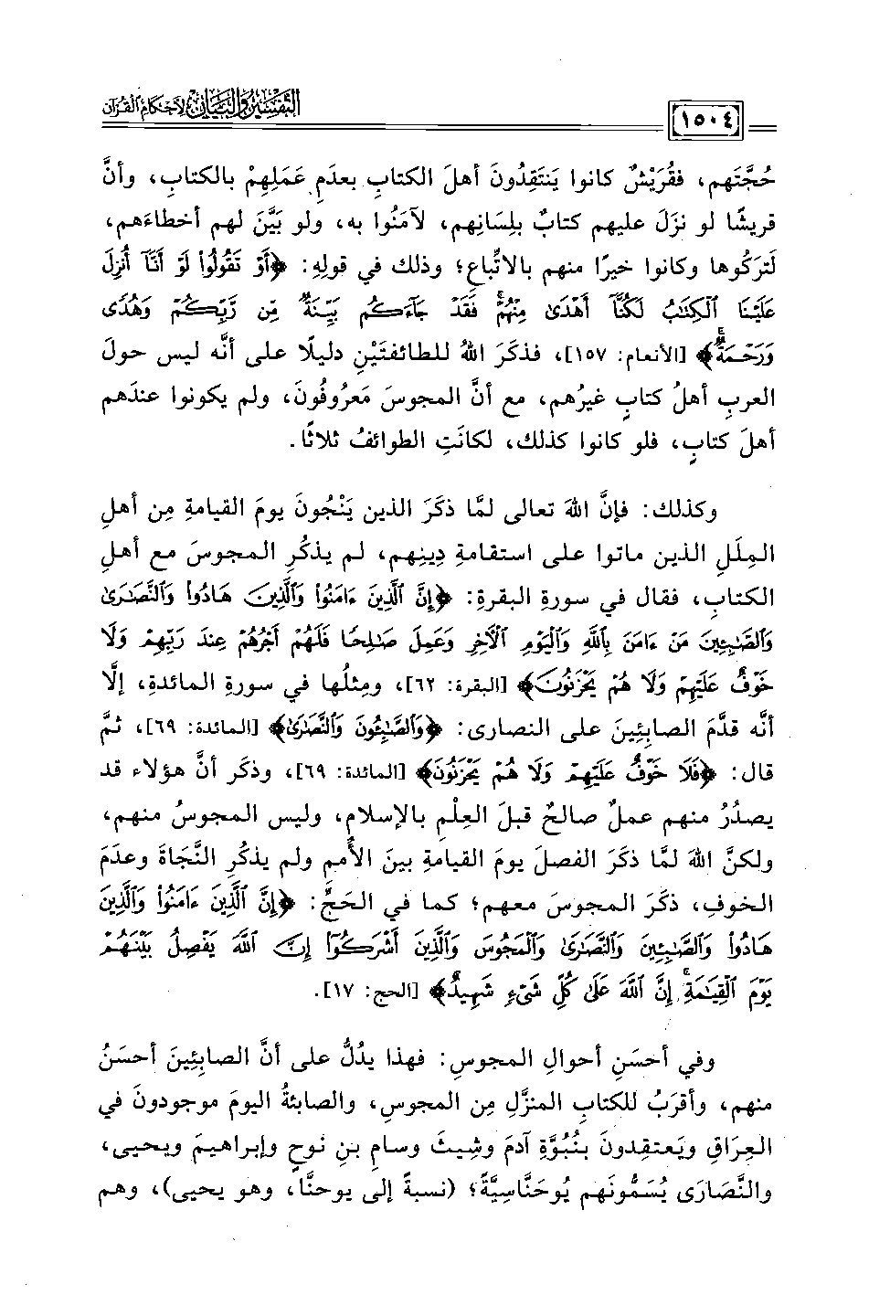 وكذلك: فإنَّ اللهَ تعالى لمَّا ذكَرَ الذين يَنْجُونَ يومَ القيامةِ مِن أهلِ المِلَلِ الذين ماتوا على استقامةِ دِينِهم، لم يذكُرِ المجوسَ مع أهلِ الكتاب، فقال في سورةِ البقرةِ: {إِنَّ الَّذِينَ آمَنُوا وَالَّذِينَ هَادُوا وَالنَّصَارَى وَالصَّابِئِينَ مَنْ آمَنَ بِاللَّهِ وَالْيَوْمِ الْآخِرِ وَعَمِلَ صَالِحًا فَلَهُمْ أَجْرُهُمْ عِنْدَ رَبِّهِمْ وَلَا خَوْفٌ عَلَيْهِمْ وَلَا هُمْ يَحْزَنُونَ (٦٢)} [البقرة: ٦٢]، ومِثلُها في سورةِ المائدة، إلَّا أنه قدَّمَ الصابِئِينَ على النصارى؟ {وَالصَّابِئُونَ وَالنَّصَارَى} [المائدة: ٦٩]، ثم قال: {فَلَا خَوْفٌ عَلَيْهِمْ وَلَا هُمْ يَحْزَنُونَ} [المائدة: ٦٩]، ، وذكَر أنَّ هؤلاء قد يصدُرُ منهم عملٌ صالحٌ قبلَ العِلْمِ بالإسلام، وليس المجوسُ منهم، ولكن اللهَ لمَّا ذكَرَ الفصلَ يومَ القيامةِ بينَ الأُممِ ولم يذكُرِ النَّجَاةَ وعدَمَ الخوف، ذكَرَ المجوسَ معهم؛ كما في الحَجّ: {إِنَّ الَّذِينَ آمَنُوا وَالَّذِينَ هَادُوا وَالصَّابِئِينَ وَالنَّصَارَى وَالْمَجُوسَ وَالَّذِينَ أَشْرَكُوا إِنَّ اللَّهَ يَفْصِلُ بَيْنَهُمْ يَوْمَ الْقِيَامَةِ إِنَّ اللَّهَ عَلَى كُلِّ شَيْءٍ شَهِيدٌ (١٧)} [الحج: ١٧].