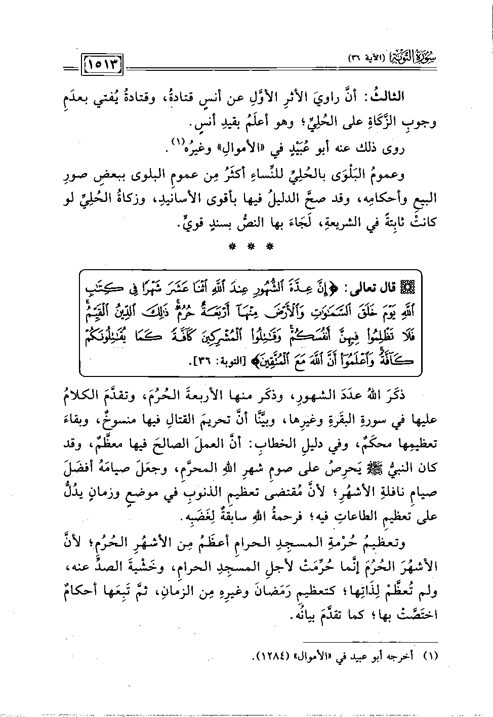 ذكَرَ اللهُ عدَدَ الشهور، وذكَر منها الأربعةَ الحُرُمَ، وتقدَّم الكلامُ عليها في سورةِ البقَرةِ وغيرِها، وبيَّنَّا أنَّ تحريمَ القتالِ فيها منسوخٌ، وبقاءَ تعظيمِها محكَمٌ، وفي دليلِ الخطابِ: أنَّ العملَ الصالحَ فيها معظَّمٌ، وقد كان النبيُّ - صلى الله عليه وسلم - يَحرِصُ على صومِ شهرِ اللهِ المحرَّم، وجعَلَ صيامَهُ أفضَلَ صيامِ نافلةِ الأشهُرِ؛ لأنَّ مُقتضى تعظيمِ الذنوبِ في موضعٍ وزمانٍ يدُلُّ على تعظيمِ الطاعاتِ فيه؛ فرحمةُ اللهِ سابقةٌ لِغَضَبِه.