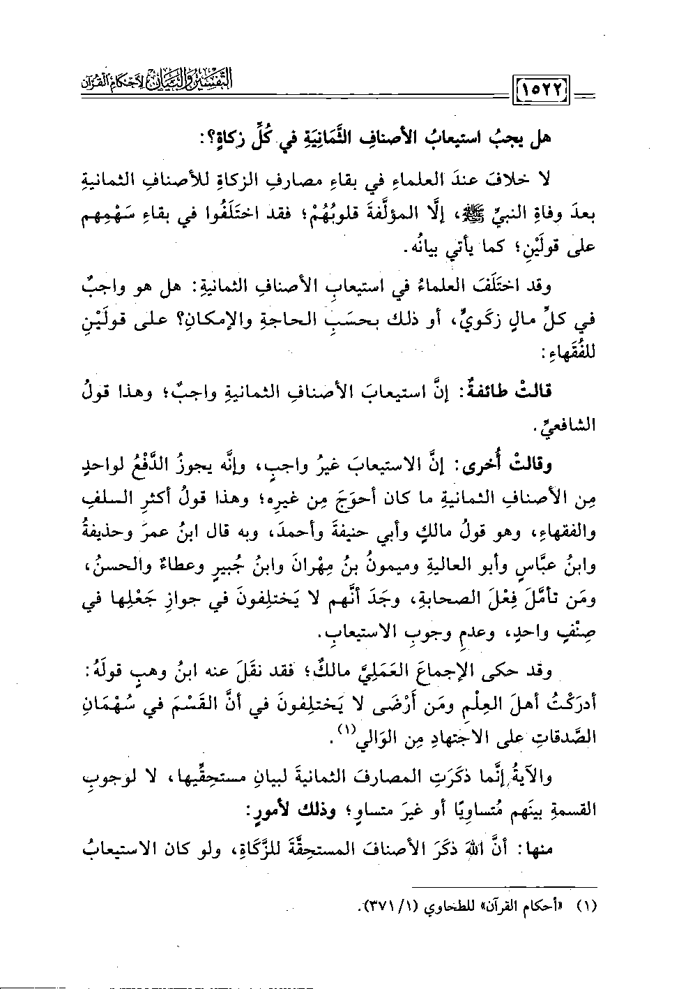 وقد اختَلَفَ العلماءُ في استيعابِ الأصنافِ الثمانيةِ: هل هو واجبٌ في كلِّ مالٍ زكَويٍّ، أو ذلك بحسَبِ الحاجةِ والإمكانِ؟ على قولَيْنِ للفقَهاءِ: