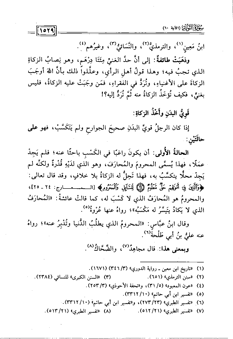 الحالةُ الأُولى: أن يكونَ راغبًا في الكَسْبِ باحثًا عنه؛ فلم يَجِدْ عمَلًا، فهذا يُسمَّى المحرومَ والمُحارَفَ، وهو الذي لدَيْهِ قُدْرةٌ ولكنَّه لم يَجِدْ محلًّا يتكسَّبُ به، فهذا تَحِلُّ له الزكاةُ بلا خلافٍ، وقد قال تعالى: {وَالَّذِينَ فِي أَمْوَالِهِمْ حَقٌّ مَعْلُومٌ (٢٤) لِلسَّائِلِ وَالْمَحْرُومِ} [المعارج: ٢٤ - ٢٥]، والمحرومُ هو المُحارَفُ الذي لا كَسْبَ له، كما قالتْ عائشةُ: "المُحارَفُ الذي لا يَكادُ يتَيسَّرُ له مَكْسَبُه"؛ رواهُ عنها عُرْوةْ (٥).