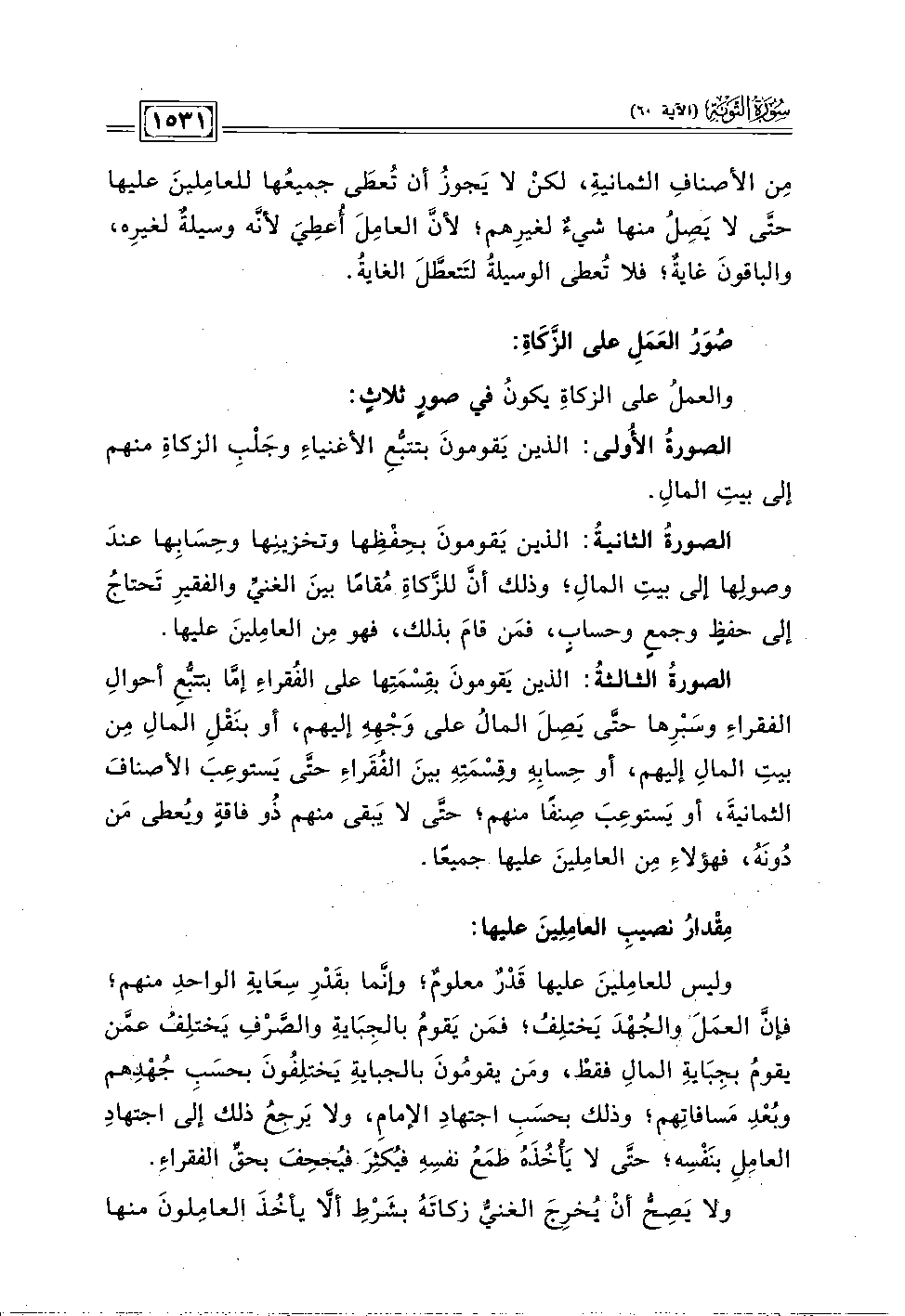 وليس للعامِلينَ عليها قَدْرٌ معلومٌ؛ وإنَّما بقَدْرِ سِعَايةِ الواحدِ منهم؛ فإنَّ العمَلَ والجُهْدَ يَختلِفُ؛ فمَن يَقومُ بالجِبَايةِ والصَّرْفِ يَختلِفُ عمَّن يقومُ بجِايةِ المالِ فقطْ، ومَن يقومُونَ بالجبايةِ يَختلِفُونَ بحسَبِ جُهْدِهم وبُعْدِ مَسافاتِهم؛ وذلك بحسَب اجتهادِ الإمام، ولا يَرجِعُ ذلك إلى اجتهادِ الحامِلِ بنَفْسِه؛ حتَّى لا يَأْخُذَهَ طمَعُ نفسِهِ فيُكثِرَ فيُجحِفَ بحقٍّ الفقراءِ.