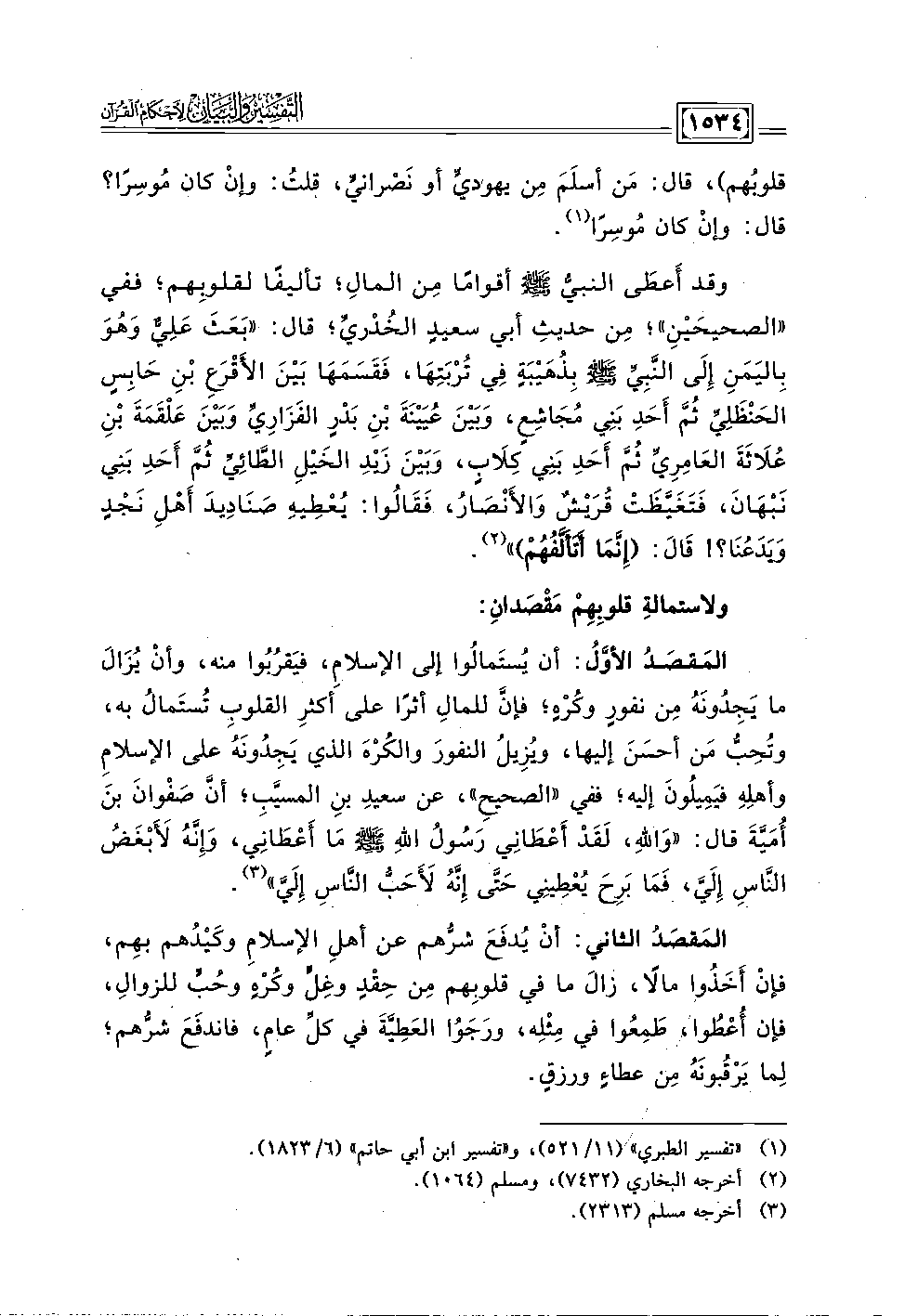 المَقصَدُ الأوَّلُ: أن يُستَمالُوا إلى الإسلام، فيَقرُبُوا منه، وأنْ يُزَالَ ما يَجِدُونَهُ مِن نفورٍ وكُرْهٍ؛ فإنَّ للمالِ أثرًا على أكثرِ القلوبِ تُستَمالُ به، وتُحِبُّ مَن أحَسنَ إليها، ويُزِيلُ النفورَ والكُرْهَ الذي يَجِدُونَهُ على الإسلامِ وأهلِهِ فيَمِيلُونَ إليه؛ ففي "الصحيحِ"، عن سعيدِ بنِ المسيَّبِ؛ أنَّ صَفْوانَ بنَ أُمَيَّةَ قال: "وَالله، لَقَدْ أَعْطَانِي رَسُولُ اللهِ - صلى الله عليه وسلم - مَا أَعْطَانِي، وَإِنَّهُ لَأَبْغَضُ النَّاسِ إِلَيَّ، فَمَا بَرِحَ يُعْطِينِي حَتَّى إِنَّهُ لَأَحَبُّ النَّاسِ إِلَيَّ" (٣).