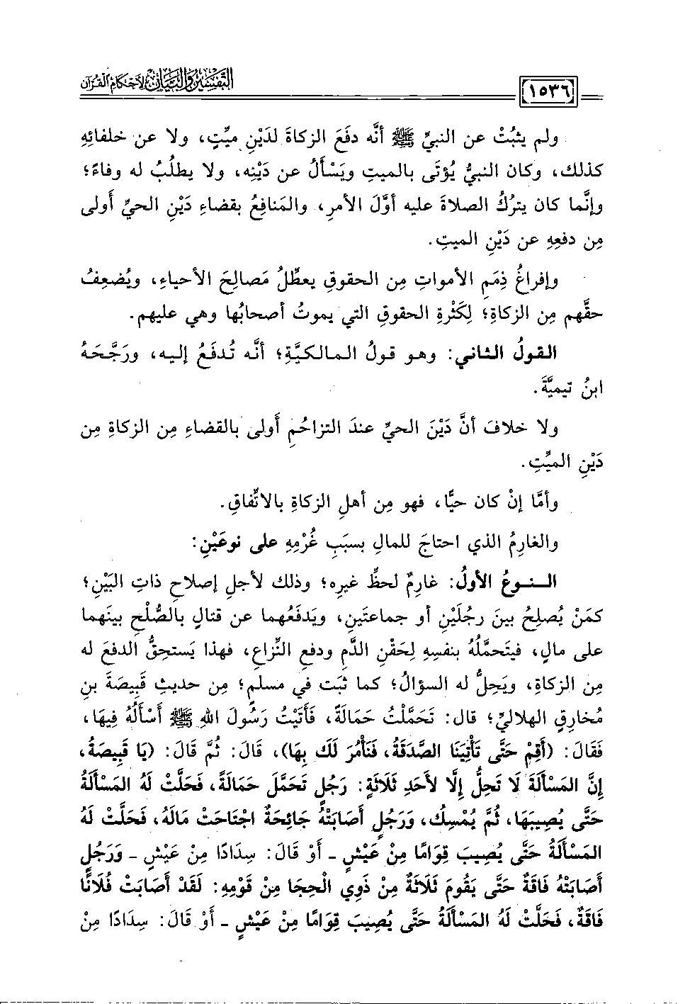 النوعُ الأولُ: غارِمٌ لحظِّ غيرِه؛ وذلك لأجلِ إصلاحِ ذاتِ البَيْنِ؛ كمَنْ يُصلِحُ بينَ رجُلَيْنِ أو جماعتَين، ويَدفَعُهما عن قتالٍ بالصُّلْحِ بينَهما على مالٍ، فيتَحمَّلُهُ بنفسِهِ لِحَقْنِ الدَّمِ ودفعِ النِّزاع، فهذا يَستحِقُّ الدفعَ له مِن الزكاة، ويَحِلُّ له السؤالُ؛ كما ثبَت في مسلمٍ؛ مِن حديثِ قَبِيصَةَ بنِ مُخارِقٍ الهلاليِّ؛ قال: تَحَمَّلْتُ حَمَالَةً، فَأَتَيْتُ رَسُولَ اللهِ - صلى الله عليه وسلم - أَسْأَلُهُ فِيهَا، فَقَالَ: (أَقِمْ حَتَّى تَأْتِيَنَا الصَّدَقَةُ، فَنَأْمُرَ لَكَ بِهَا)، قَالَ: ثُمَّ قَالَ: (يَا قَبِيصَةُ، إِنَّ المَسأَلَةَ لَا تَحِلُّ إِلَّا لأَحَدِ ثَلَاثَةٍ: رَجُلٍ تَحَمَّلَ حَمَالَةً، فَحَلَّتْ لَهُ الَمَسْأَلَةُ حَتَّى يُصِيبَهَا، ثُمَّ يُمْسِكُ، وَرَجُلٍ أَصَابَتْهُ جَائِحَةٌ اجْتَاحَتْ مَالَهُ، فَحَلَّتْ لَهُ المَسْأَلَةُ حَتَّى يُصِيبَ قِوَامًا مِنْ عَيْشٍ - أَو قَالَ: سِدَادًا مِنْ عَيْشٍ - وَرَجُلٍ أَصَابَتْهُ فَاقَةٌ حَتَّى يَقُومَ ثَلَاثَةٌ مِنْ ذَوِي الْحِجَا مِنْ قَوْمِهِ: لَقَدْ أَصَابَتْ فُلَانًا فَاقَةٌ، فَحَلَّتْ لَهُ المَسْأَلَةُ حَتَّى يُصِيبَ قِوَامًا مِنْ عَيْشٍ - أَو قَالَ: سِدَادًا مِنْ