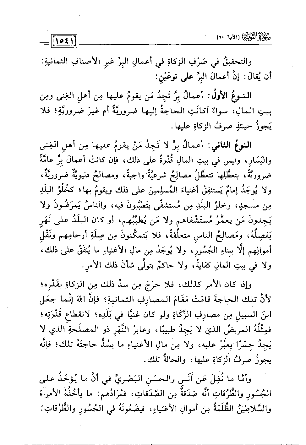والتحقيقُ في صَرْفِ الزكاةِ في أعمالِ الِبرِّ غيرِ الأصنافِ الثمانيةِ: أن يُقالَ: إنَّ أعمالَ البِرِّ على نوعَيْنِ: