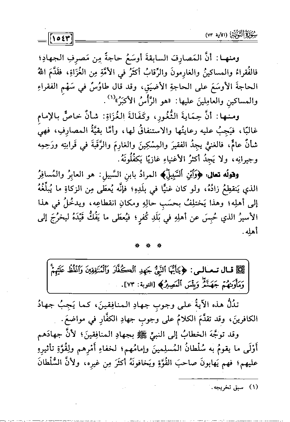 ومنها: أنَّ المَصارِفَ السابقةَ أوسَعُ حاجةً مِن مَصرِفِ الجهادِ؛ فالفُقراءُ والمساكينُ والغارِمونَ والرِّقابُ أكثَرُ في الأمَّةِ مِن الغُزَاة، فقَدَّمَ اللهُ الحاجةَ الأوسَعَ على الحاجةِ الأضيَق، وقد قال طاوُسٌ في سَهْمِ الفقراءِ والمساكينِ والعامِلينَ عليها: "هو الرَّأْسُ الأكبَرُ" (١).