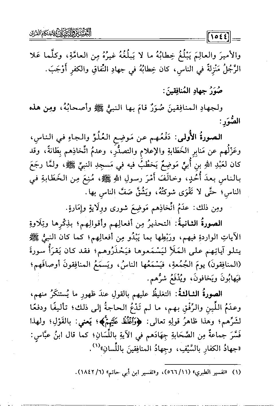 والأميرَ والعالِمَ يَبْلُغُ خِطابُهُ ما لا يَبلُغُهُ غيرُهُ مِن العامَّة، وكلَّما عَلا الرَّجُلُ مَنْزِلةً في الناس، كان خِطابُهُ في جهادِ النِّفاق والكفرِ أَوْجَبَ.