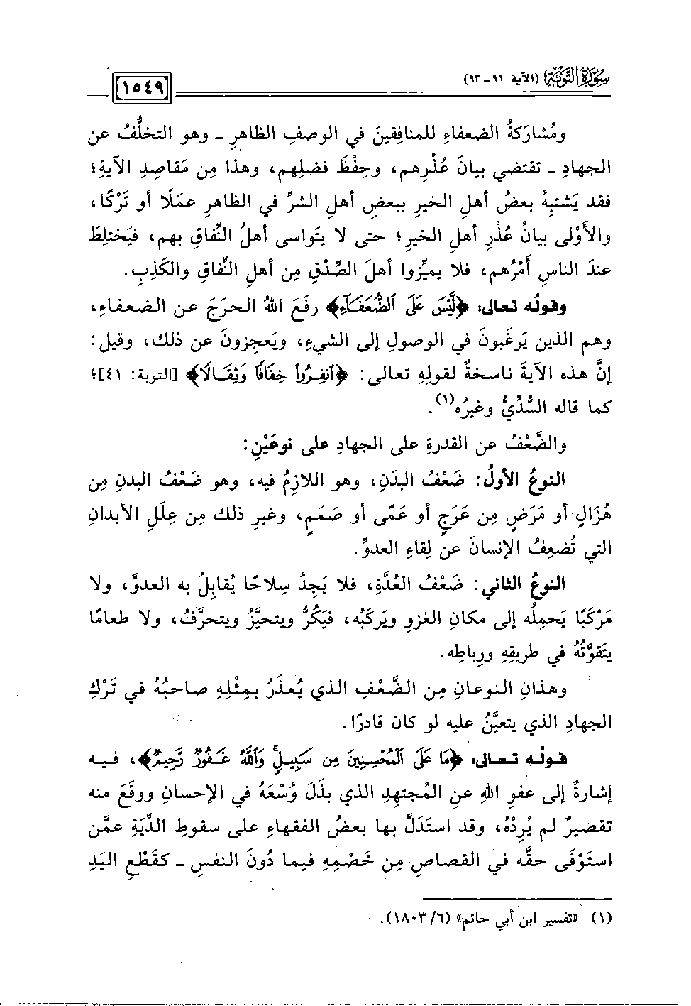وهذانِ النوعانِ مِن الضَّعْفِ الذي يُعذَرُ بمِثْلِهِ صاحبُهُ في تَرْكِ الجهادِ الذي يتعيَّنُ عليه لو كان قادرًا.