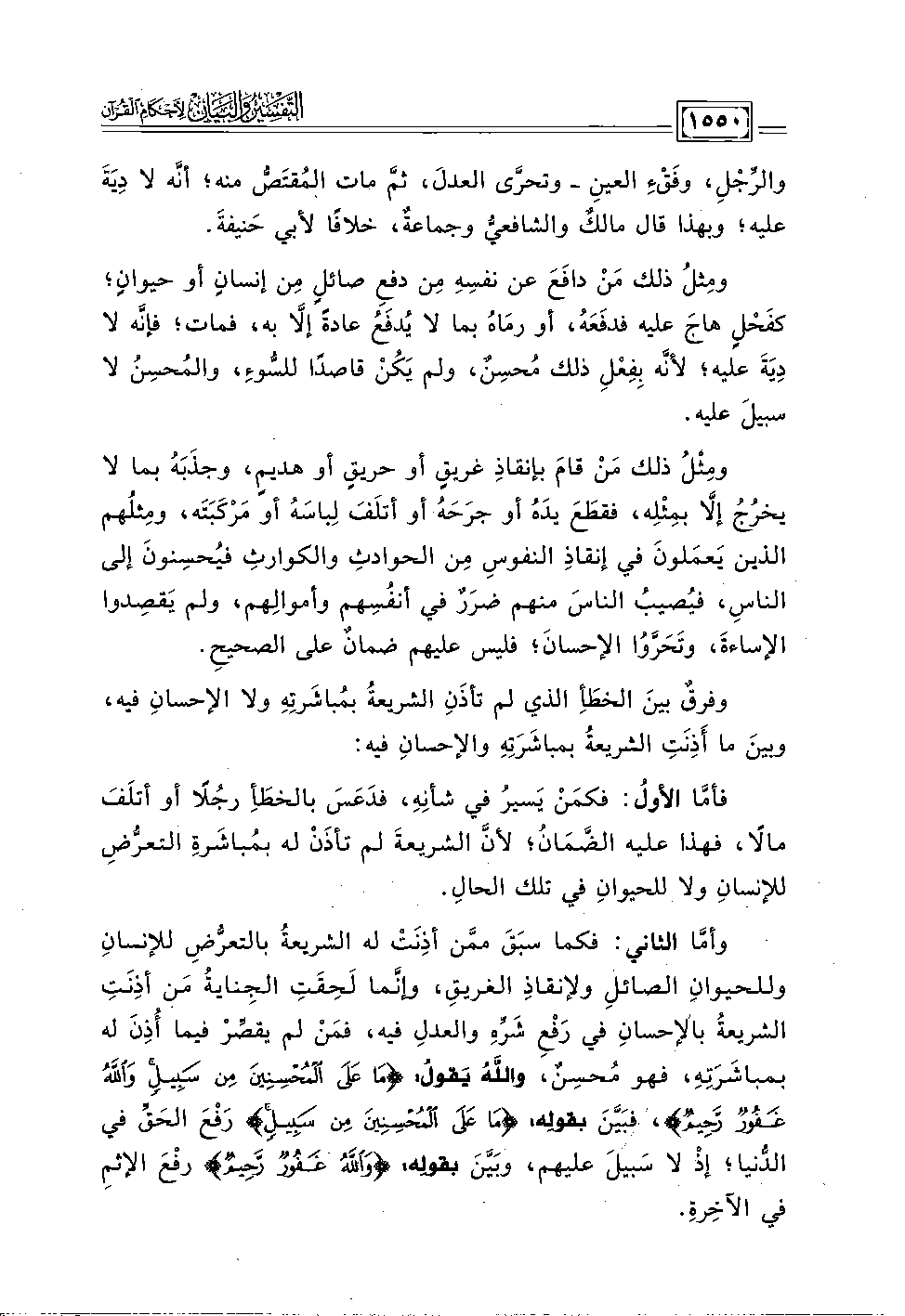 وأمَّا الثاني: فكما سبَقَ ممَّن أذِنَتْ له الشريعةُ بالتعرُّضِ للإنسانِ وللحيوانِ الصائلِ ولإنقاذِ الغريق، وإنَّما لَحِقَتِ الجِنايةُ مَن أذِنَتِ الشريعةُ بالإحسانِ في رَفْعِ شَرِّهِ والعدلِ فيه، فمَنْ لم يقصِّرْ فيما أُذِنَ له بمباشَرَتِه، فهو مُحسِنٌ، واللهُ يَقولُ: {مَا عَلَى الْمُحْسِنِينَ مِنْ سَبِيلٍ وَاللَّهُ غَفُورٌ رَحِيمٌ}، فبَيَّنَ بقولِه: {مَا عَلَى الْمُحْسِنِينَ مِنْ سَبِيلٍ} رَفْعَ الحَقِّ في الدُّنيا؛ إذْ لا سَبيلَ عليهم، وبَيَّنَ بقولِه: {وَاللَّهُ غَفُورٌ رَحِيمٌ} رفْعَ الإثمِ في الآخِرةِ.