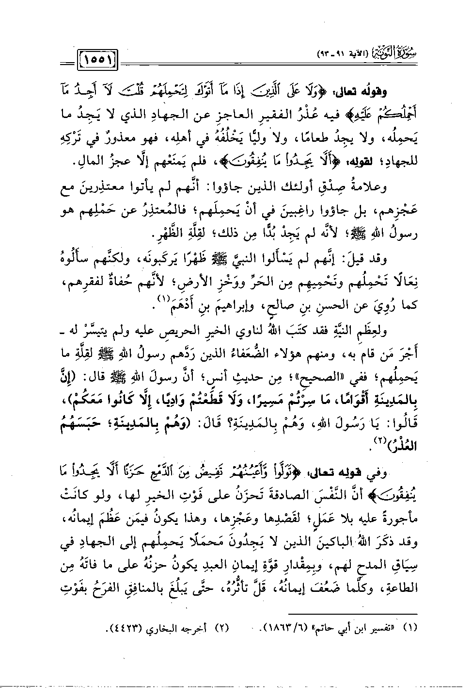 وفي قوله تعالى: {تَوَلَّوْا وَأَعْيُنُهُمْ تَفِيضُ مِنَ الدَّمْعِ حَزَنًا أَلَّا يَجِدُوا مَا يُنْفِقُونَ} أنَّ النَّفْسَ الصادقةَ تَحزَنُ على فَوْتِ الخيرِ لها، ولو كانَتْ مأجورةً عليه بلا عَمَلٍ؛ لقَصْدِها وعَجْزِها، وهذا يكونُ فيمَن عَظُمَ إيمانُه، وقد ذكَرَ اللهُ الباكينَ الذين لا يَجِدُونَ مَحمَلًا يَحمِلُهم إلى الجهادِ في سِيَاقِ المدح لهم، وبِمِقْدارِ قوَّةِ إيمانِ العبدِ يكونُ حزنُهُ على ما فاتَهُ مِن الطاعة، وكلَّما ضَعُفَ إيمانُهُ، قَلَّ تأثُّرُهُ، حتَّى يَبلُغَ بالمنافِقِ الفرَحُ بفَوْتِ